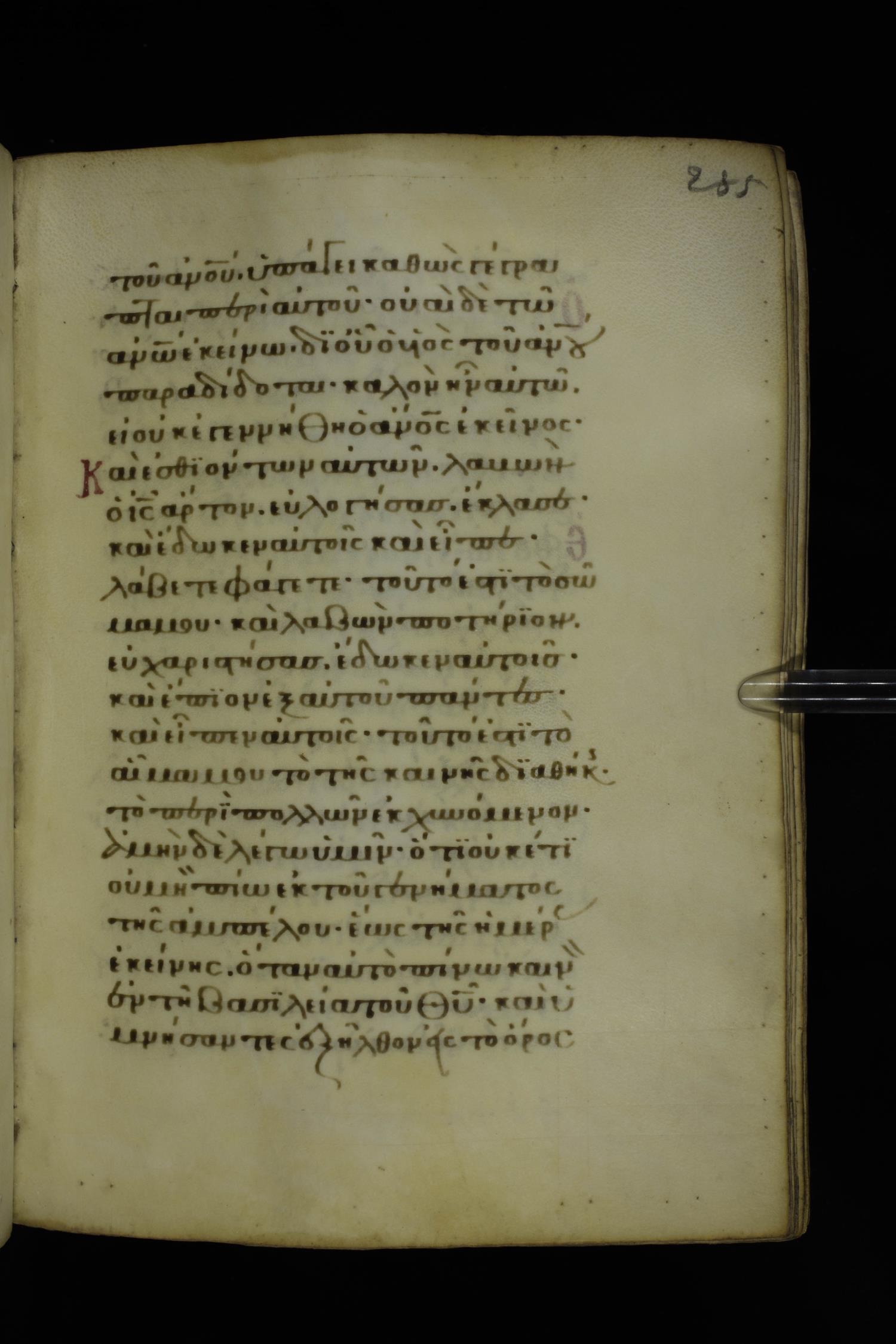 Fourteenth century minuscule of the Gospels on parchment; 332 leaves, 1 column, 21 lines per column. Images were taken at the National Library of Greece in Athens.
