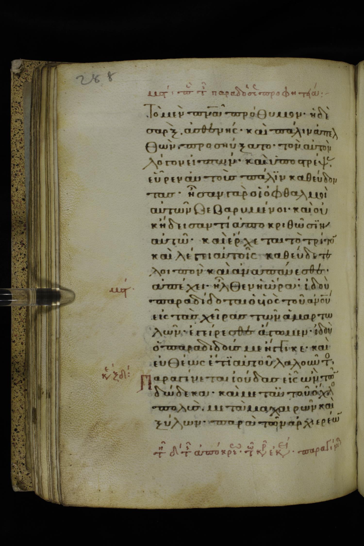 Fourteenth century minuscule of the Gospels on parchment; 332 leaves, 1 column, 21 lines per column. Images were taken at the National Library of Greece in Athens.