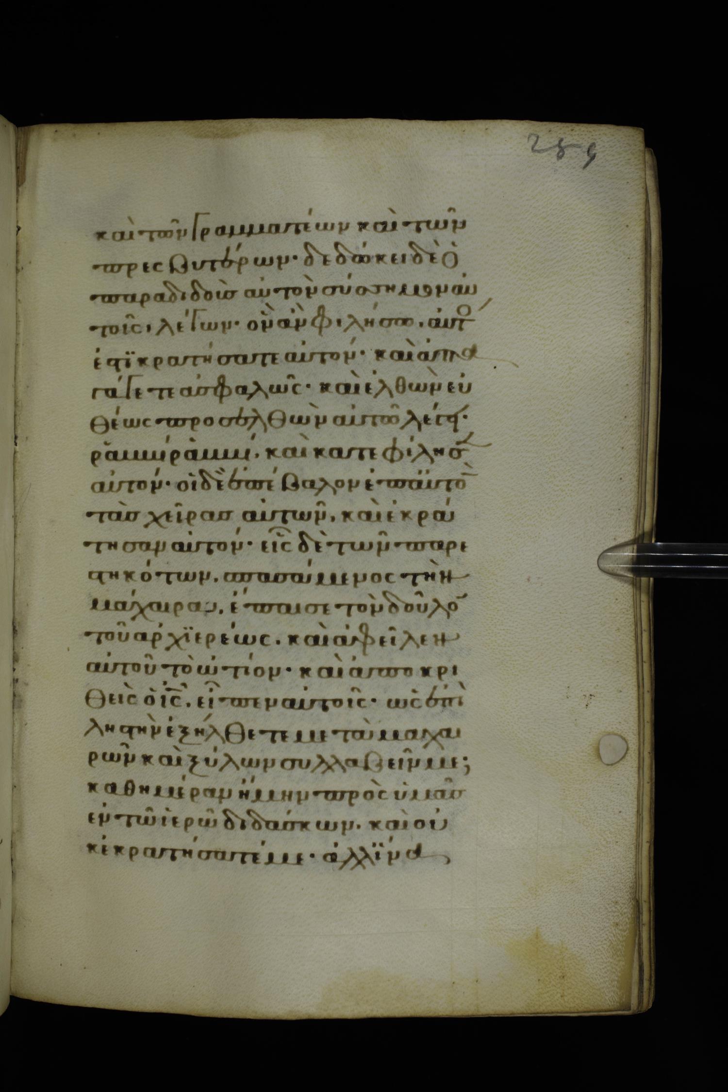 Fourteenth century minuscule of the Gospels on parchment; 332 leaves, 1 column, 21 lines per column. Images were taken at the National Library of Greece in Athens.