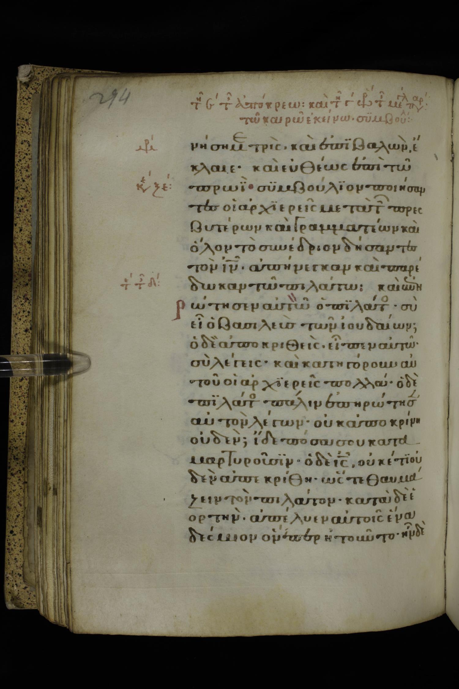 Fourteenth century minuscule of the Gospels on parchment; 332 leaves, 1 column, 21 lines per column. Images were taken at the National Library of Greece in Athens.