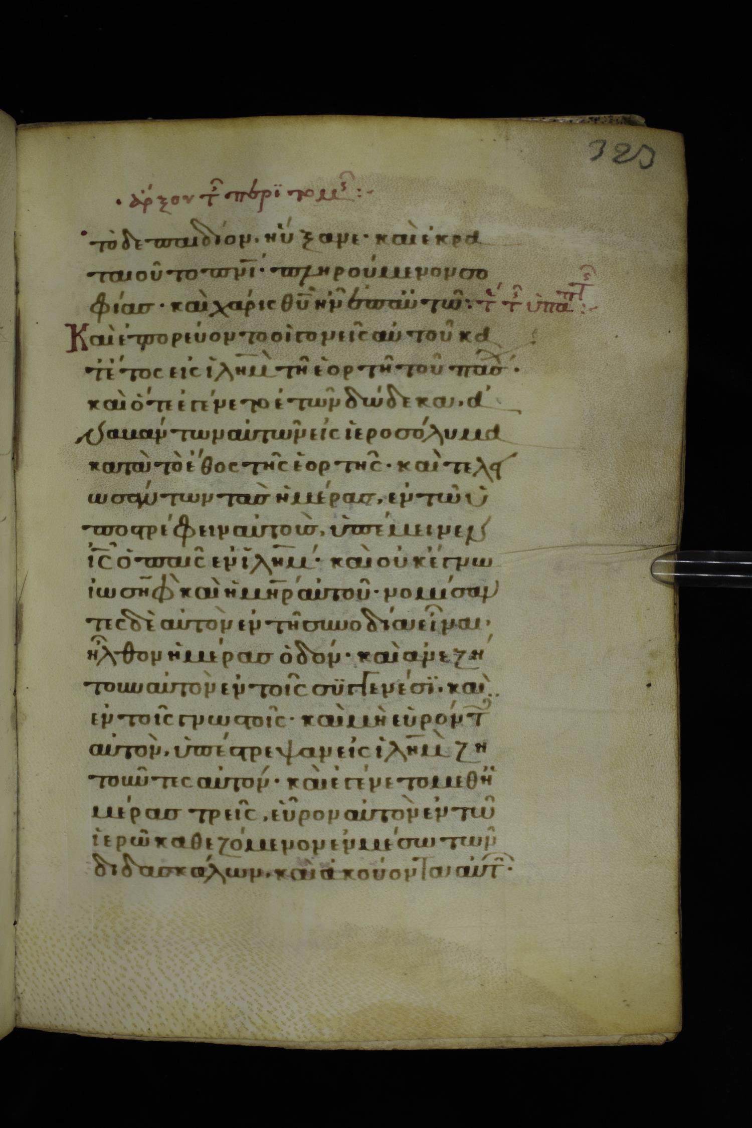 Fourteenth century minuscule of the Gospels on parchment; 332 leaves, 1 column, 21 lines per column. Images were taken at the National Library of Greece in Athens.