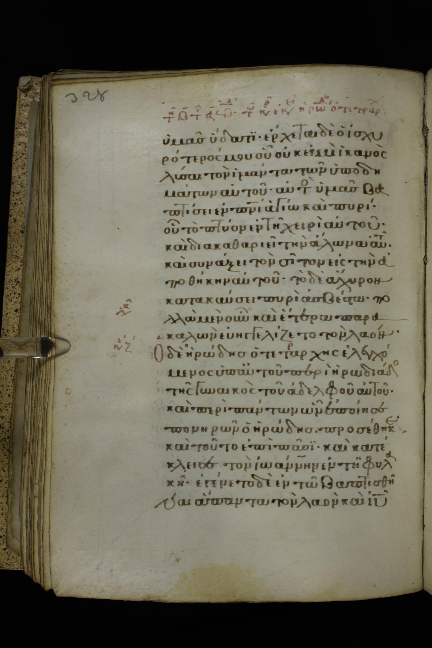 Fourteenth century minuscule of the Gospels on parchment; 332 leaves, 1 column, 21 lines per column. Images were taken at the National Library of Greece in Athens.