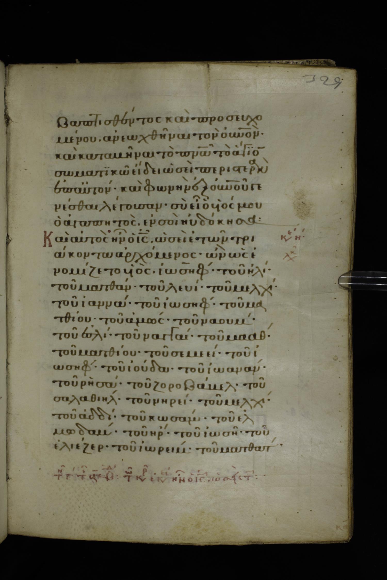 Fourteenth century minuscule of the Gospels on parchment; 332 leaves, 1 column, 21 lines per column. Images were taken at the National Library of Greece in Athens.