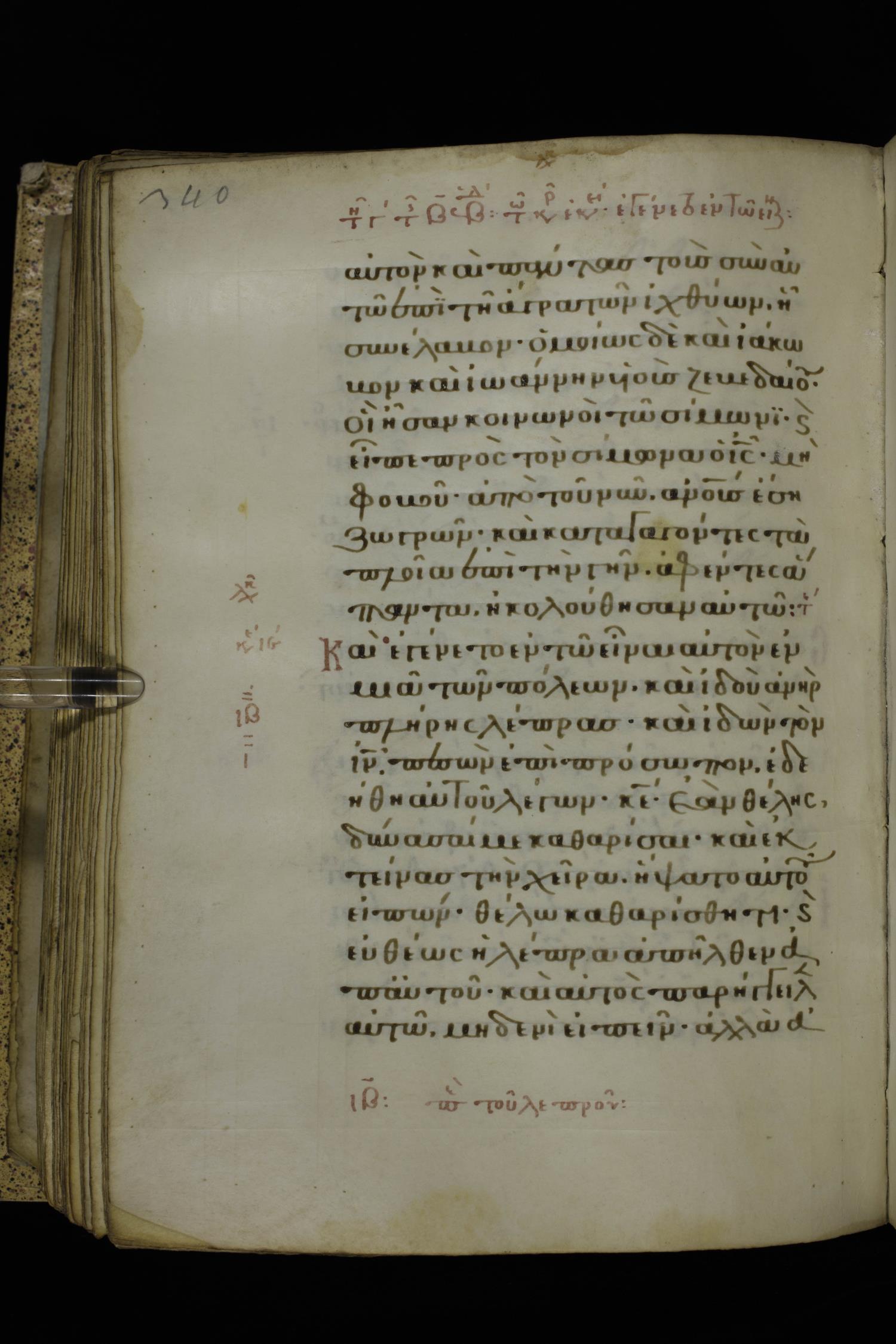Fourteenth century minuscule of the Gospels on parchment; 332 leaves, 1 column, 21 lines per column. Images were taken at the National Library of Greece in Athens.