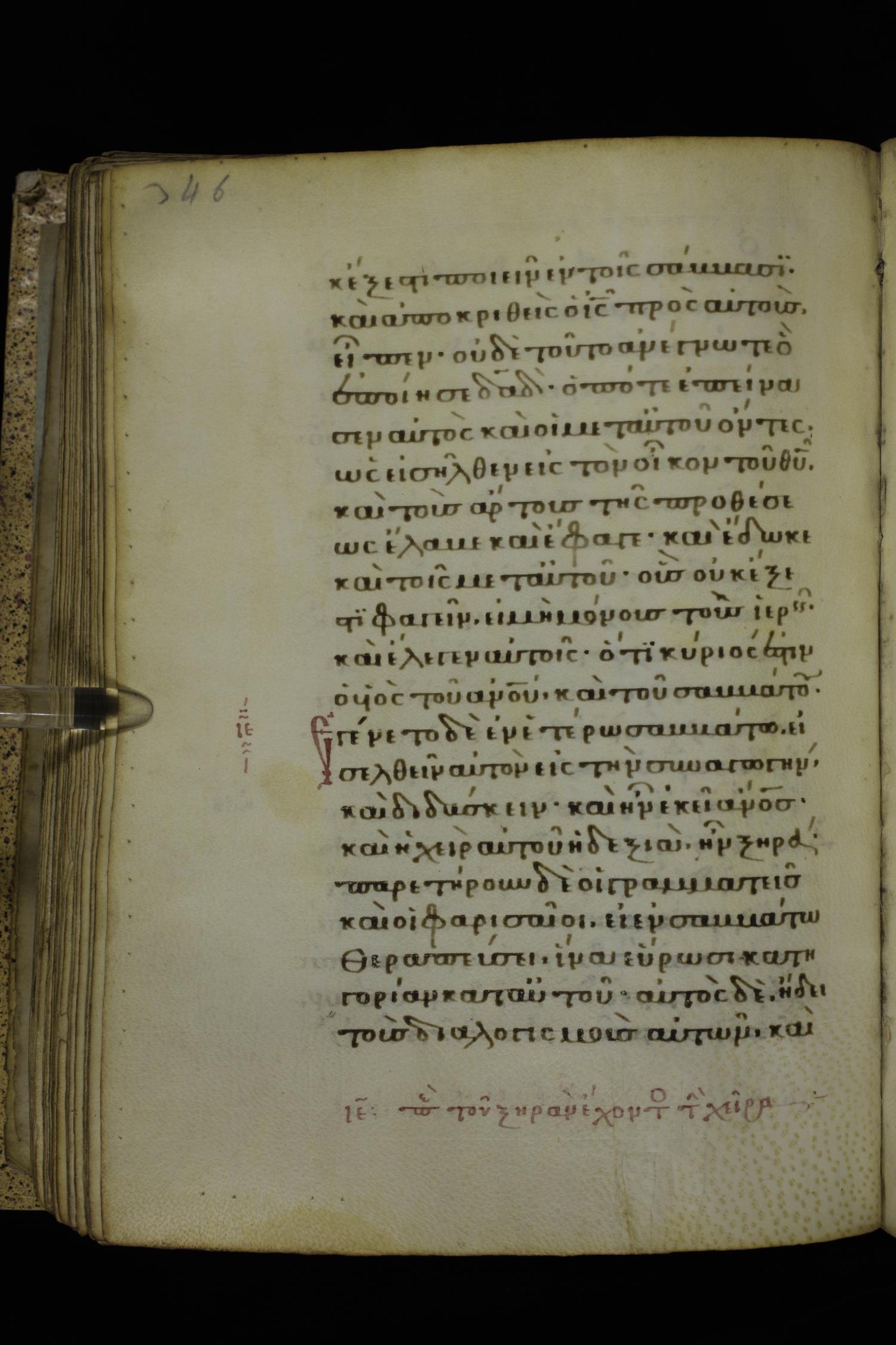 Fourteenth century minuscule of the Gospels on parchment; 332 leaves, 1 column, 21 lines per column. Images were taken at the National Library of Greece in Athens.