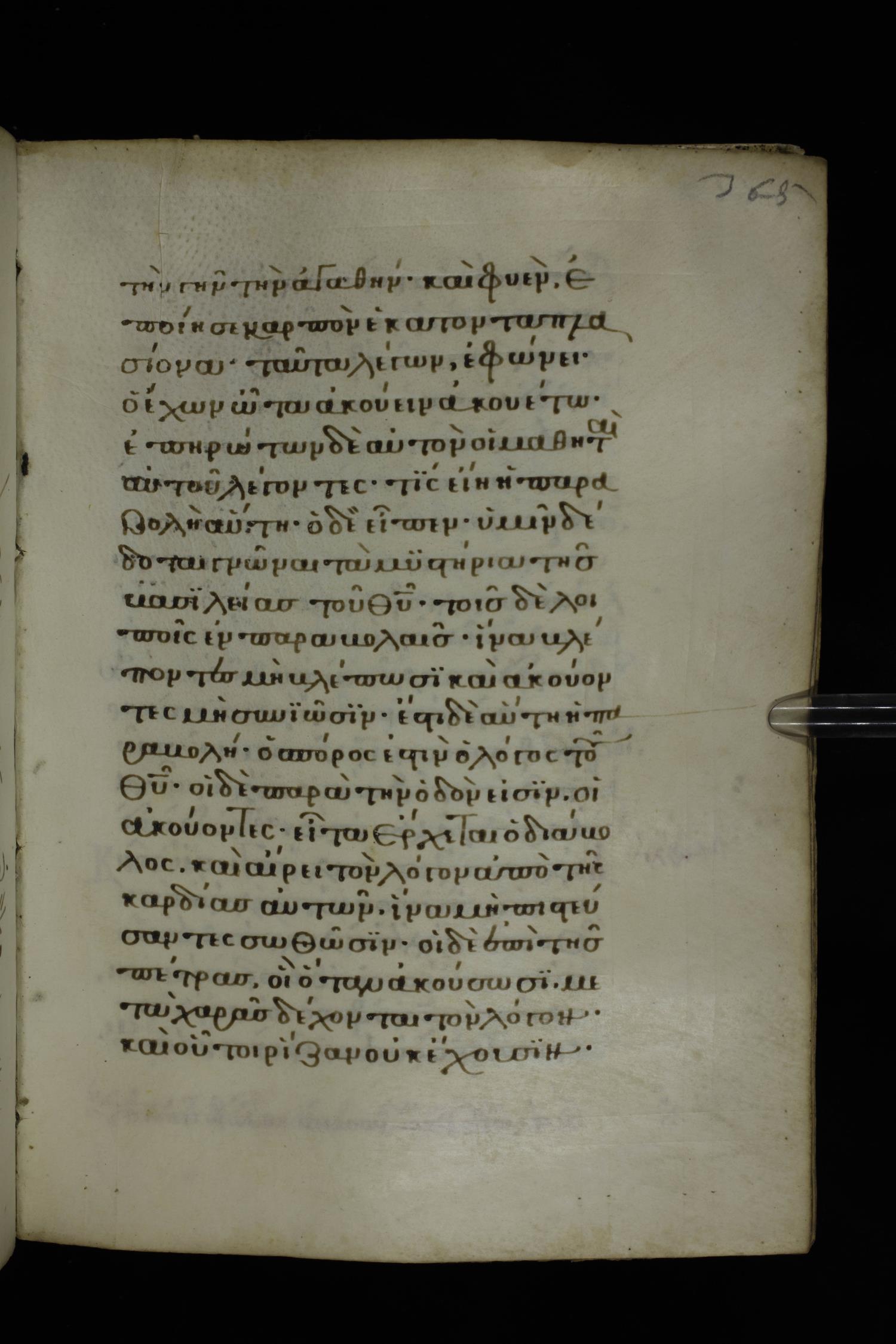 Fourteenth century minuscule of the Gospels on parchment; 332 leaves, 1 column, 21 lines per column. Images were taken at the National Library of Greece in Athens.