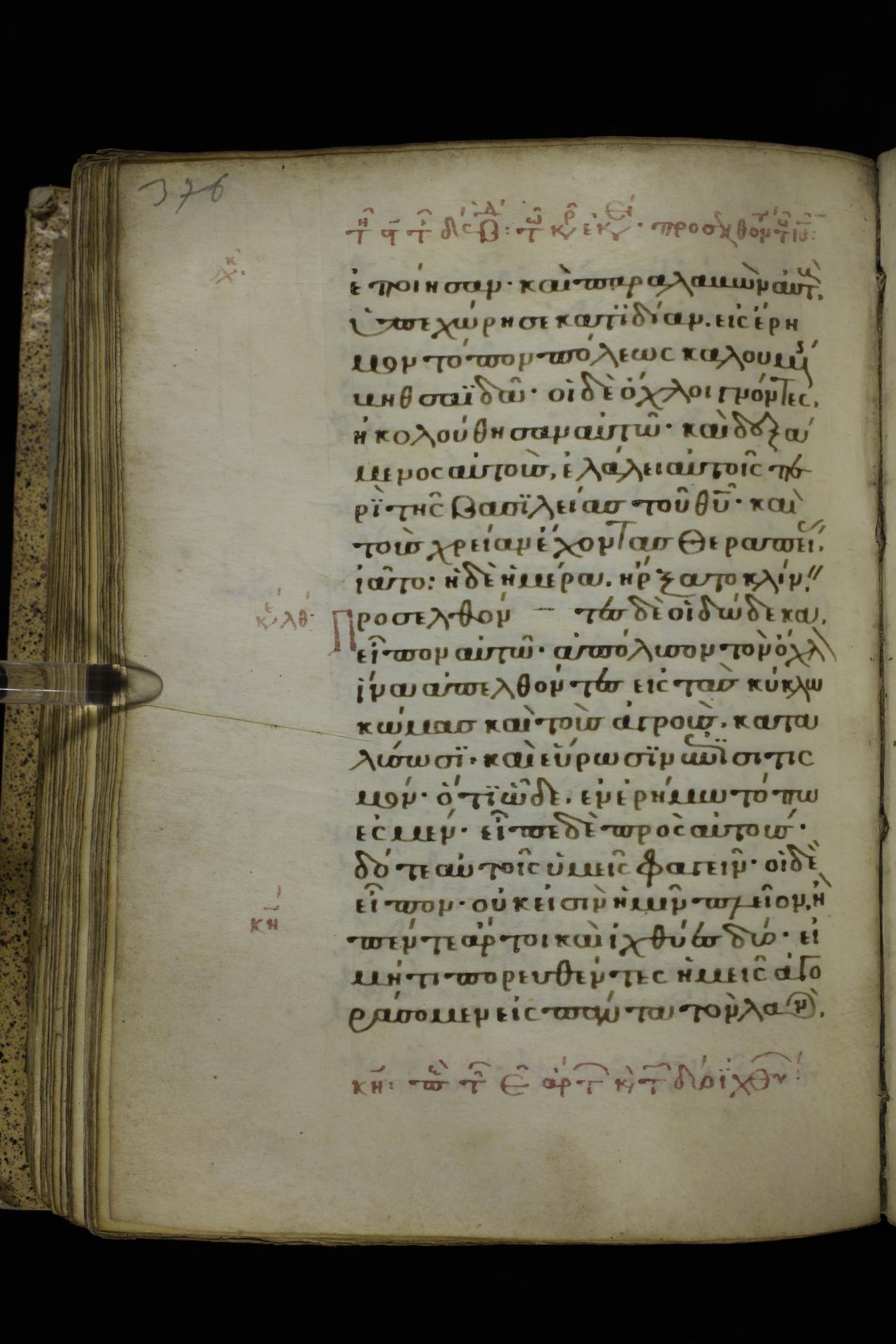 Fourteenth century minuscule of the Gospels on parchment; 332 leaves, 1 column, 21 lines per column. Images were taken at the National Library of Greece in Athens.