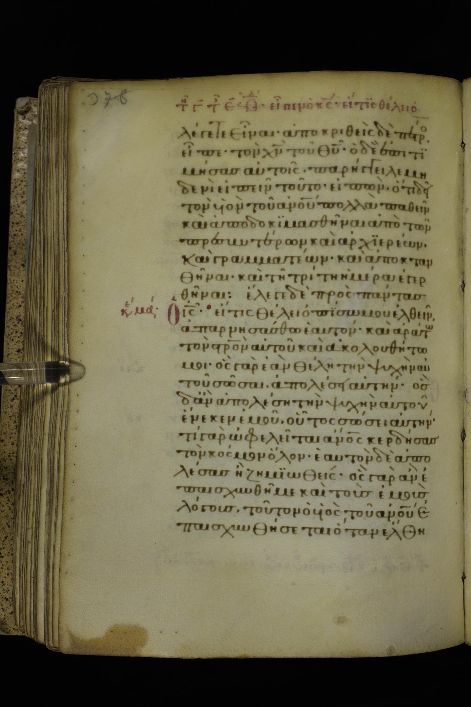 Fourteenth century minuscule of the Gospels on parchment; 332 leaves, 1 column, 21 lines per column. Images were taken at the National Library of Greece in Athens.