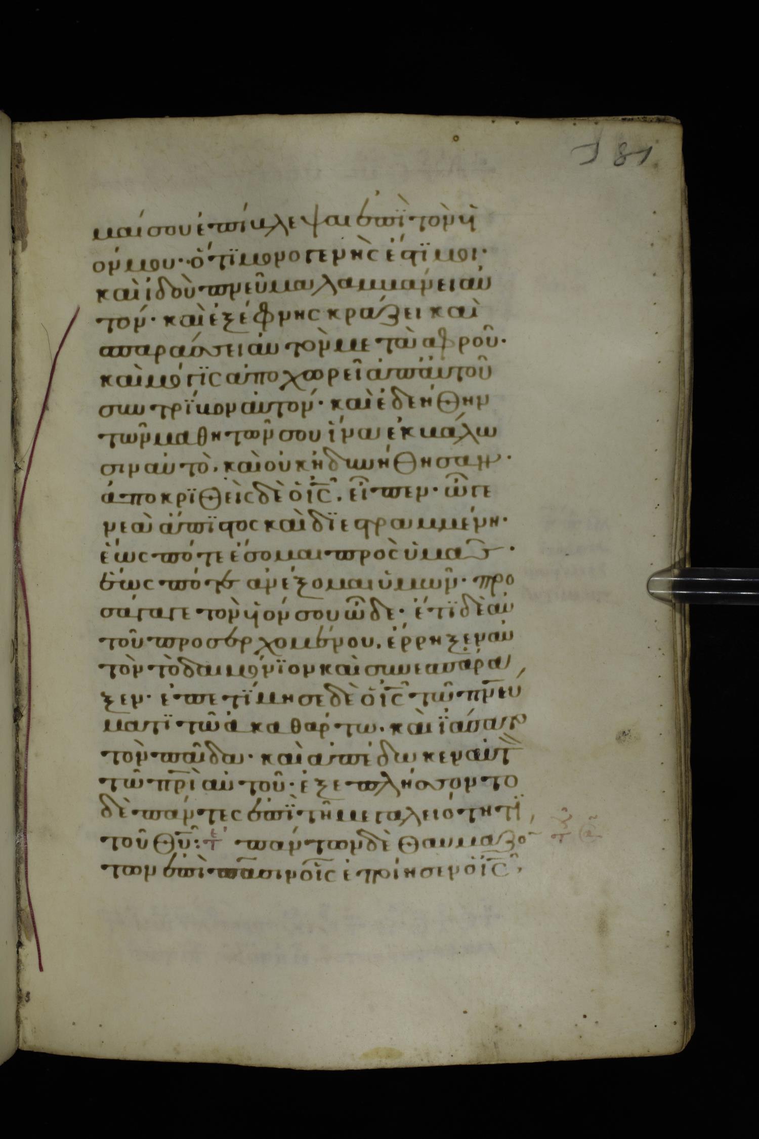 Fourteenth century minuscule of the Gospels on parchment; 332 leaves, 1 column, 21 lines per column. Images were taken at the National Library of Greece in Athens.
