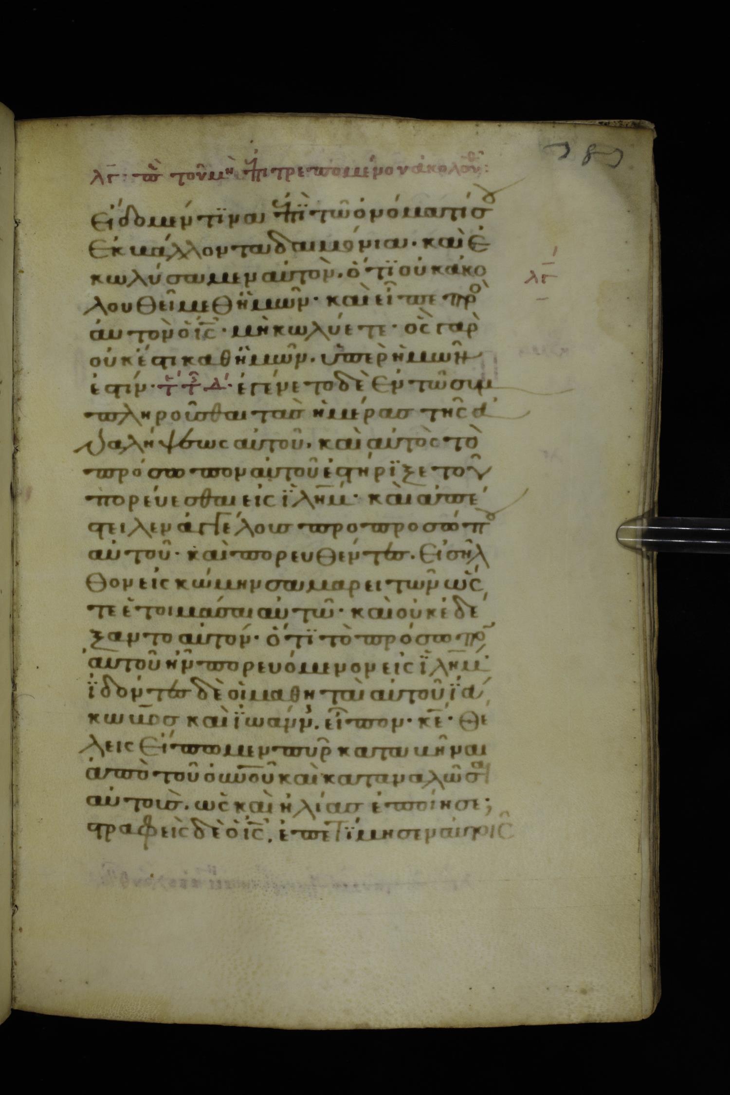 Fourteenth century minuscule of the Gospels on parchment; 332 leaves, 1 column, 21 lines per column. Images were taken at the National Library of Greece in Athens.