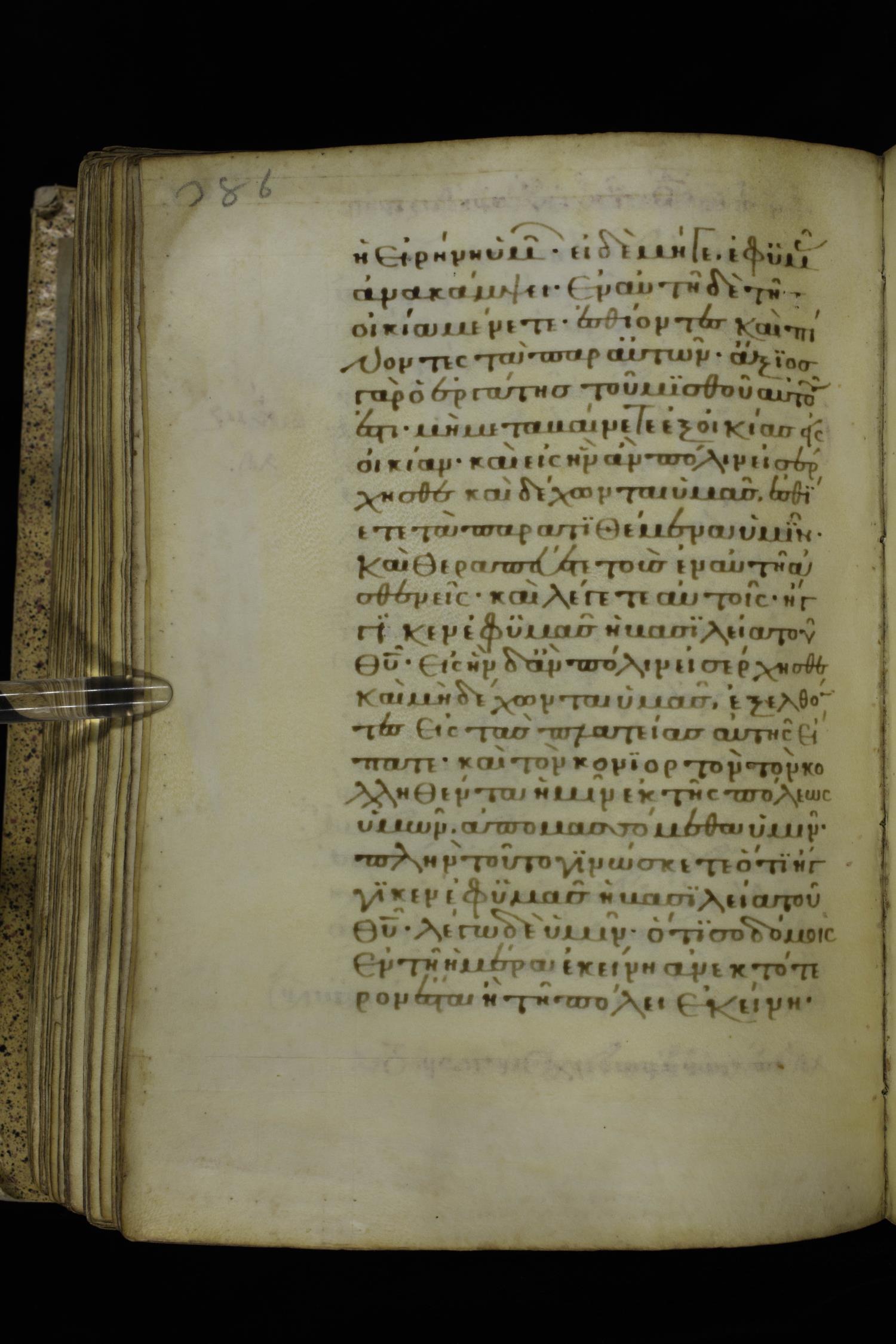 Fourteenth century minuscule of the Gospels on parchment; 332 leaves, 1 column, 21 lines per column. Images were taken at the National Library of Greece in Athens.