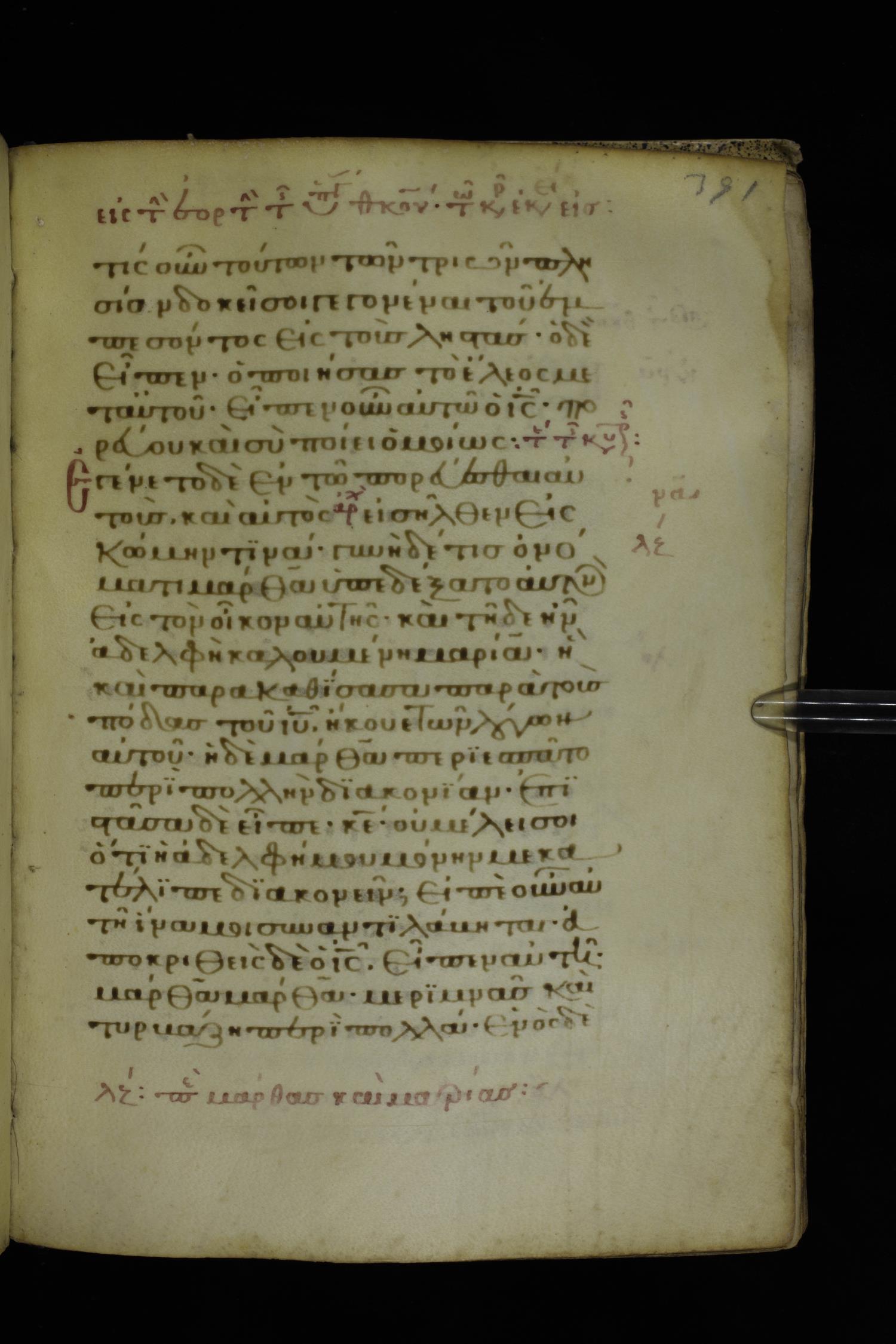 Fourteenth century minuscule of the Gospels on parchment; 332 leaves, 1 column, 21 lines per column. Images were taken at the National Library of Greece in Athens.