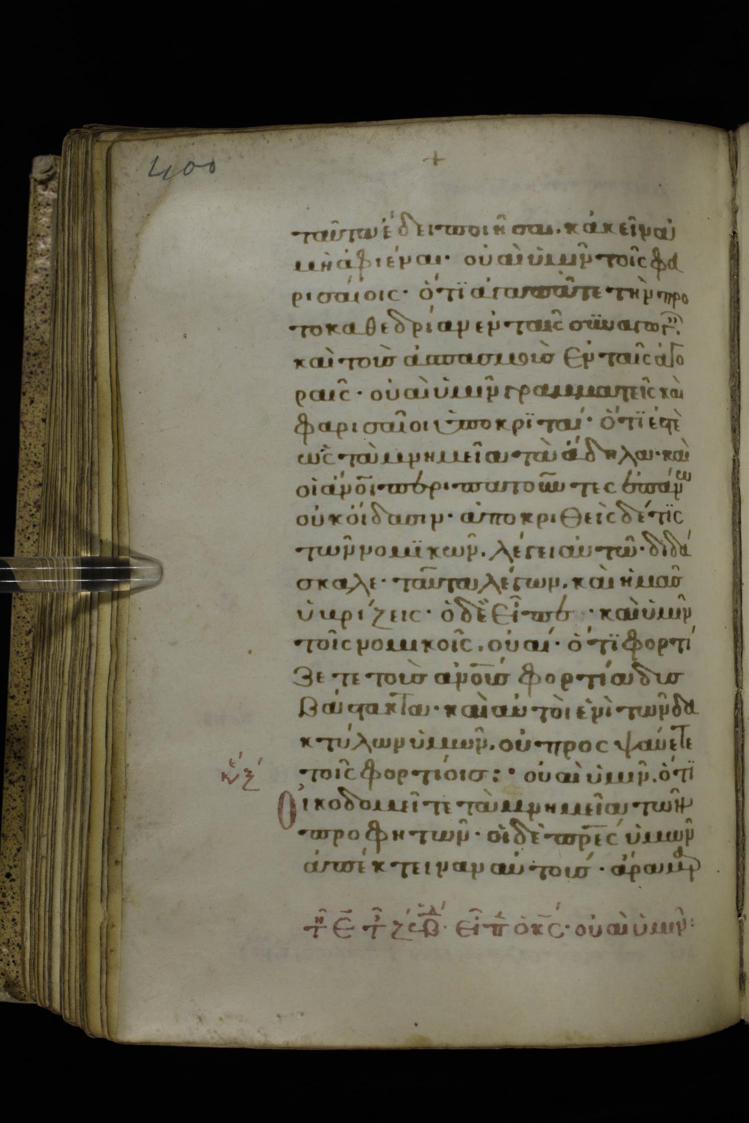 Fourteenth century minuscule of the Gospels on parchment; 332 leaves, 1 column, 21 lines per column. Images were taken at the National Library of Greece in Athens.