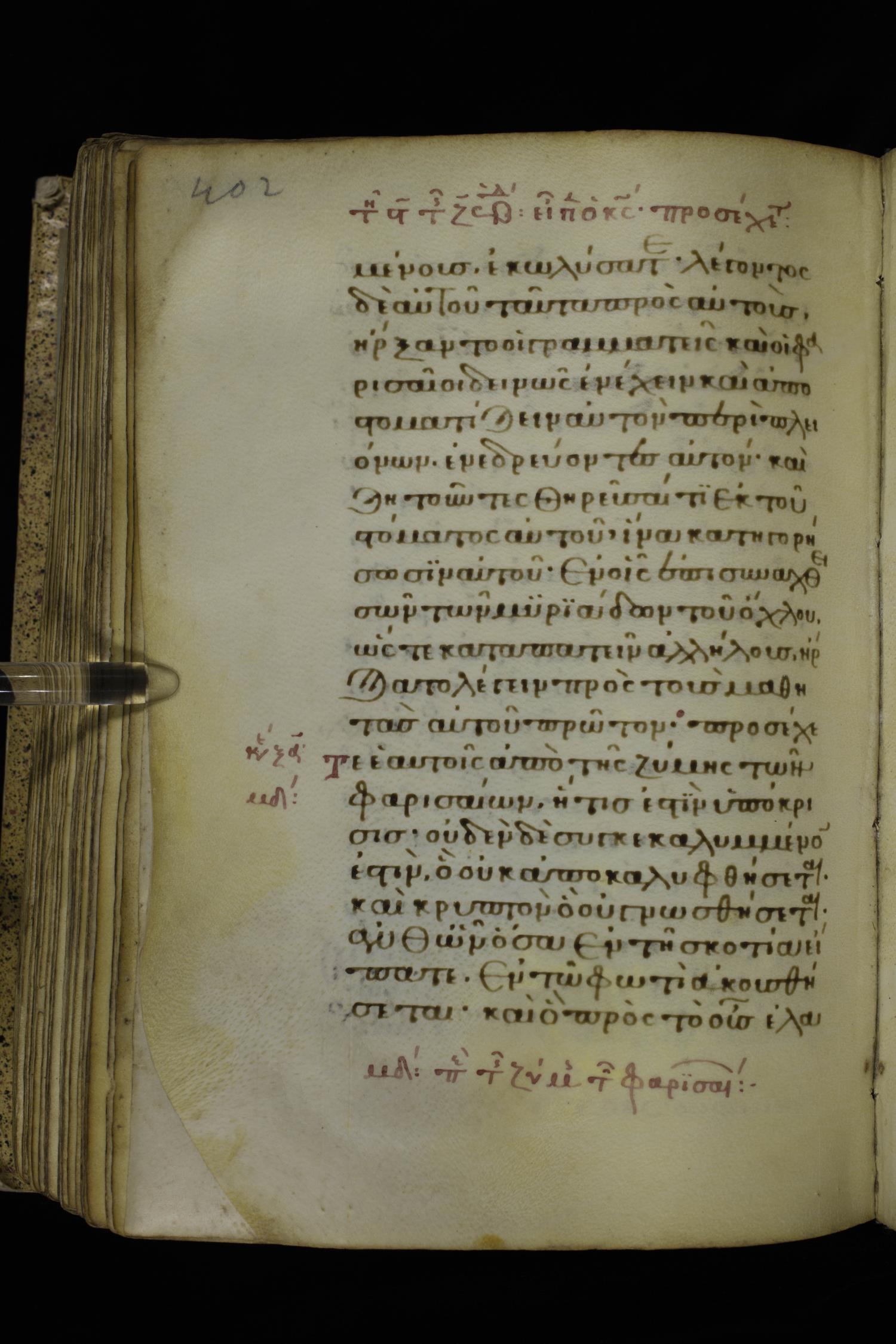 Fourteenth century minuscule of the Gospels on parchment; 332 leaves, 1 column, 21 lines per column. Images were taken at the National Library of Greece in Athens.