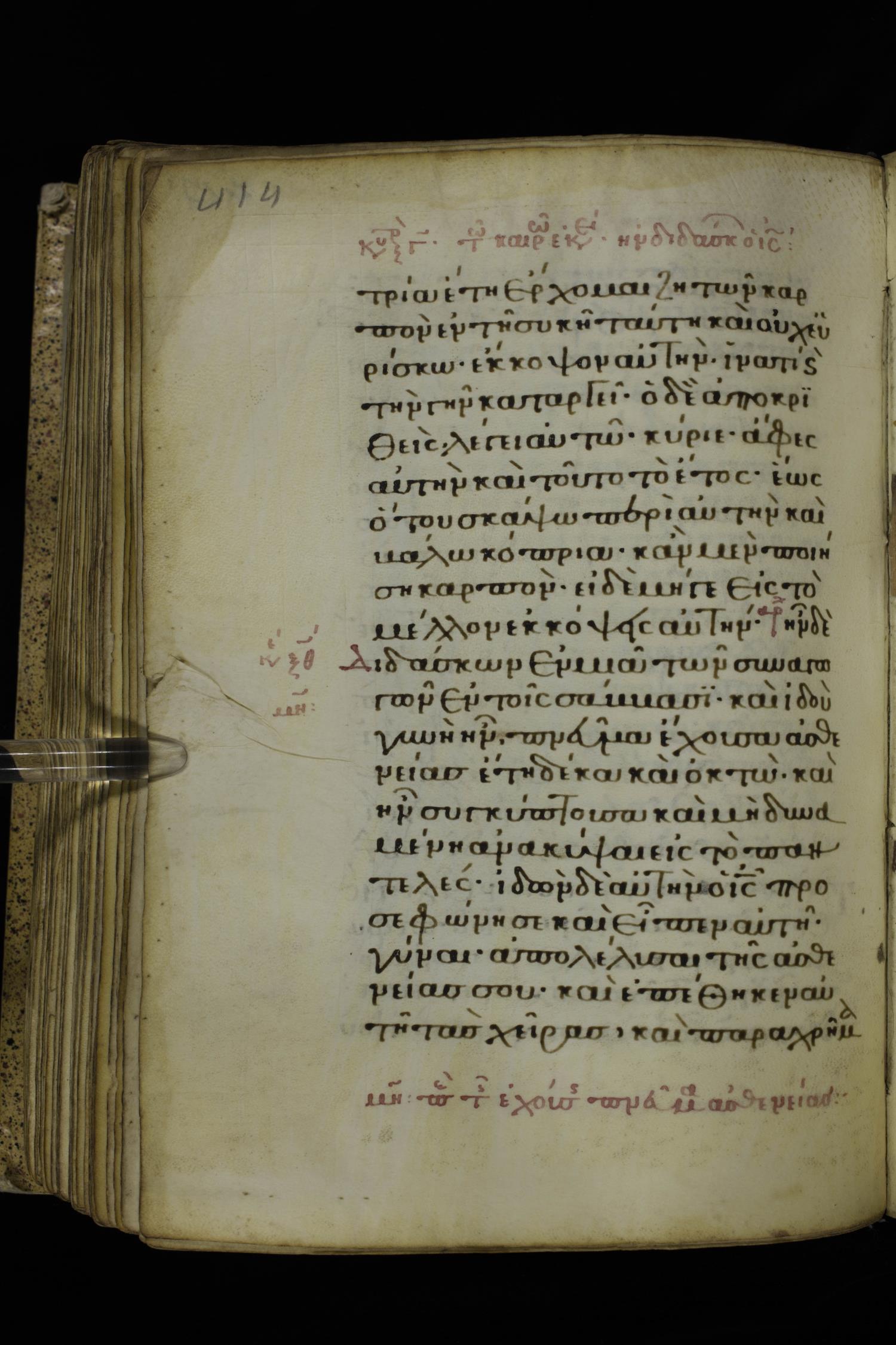 Fourteenth century minuscule of the Gospels on parchment; 332 leaves, 1 column, 21 lines per column. Images were taken at the National Library of Greece in Athens.