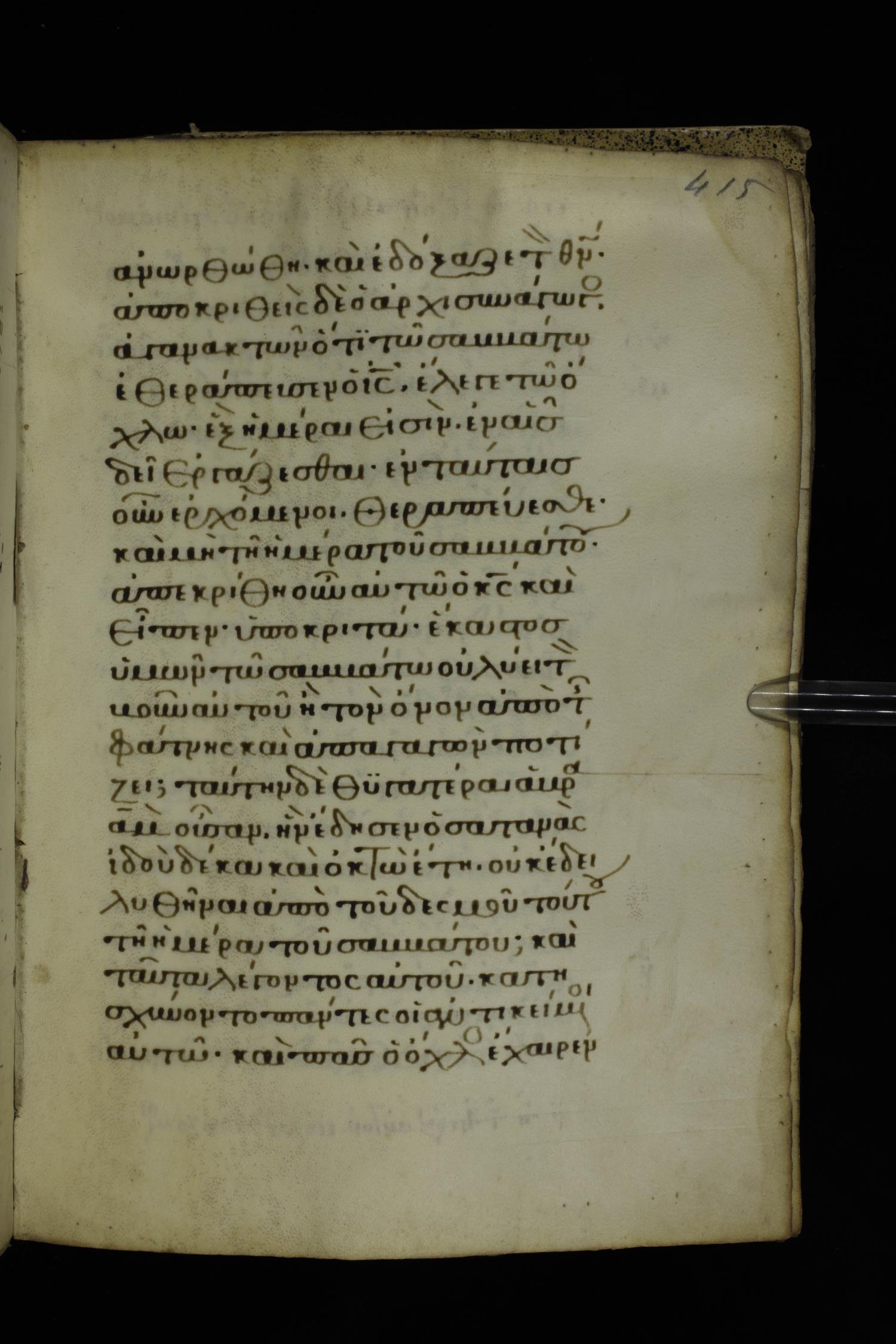 Fourteenth century minuscule of the Gospels on parchment; 332 leaves, 1 column, 21 lines per column. Images were taken at the National Library of Greece in Athens.