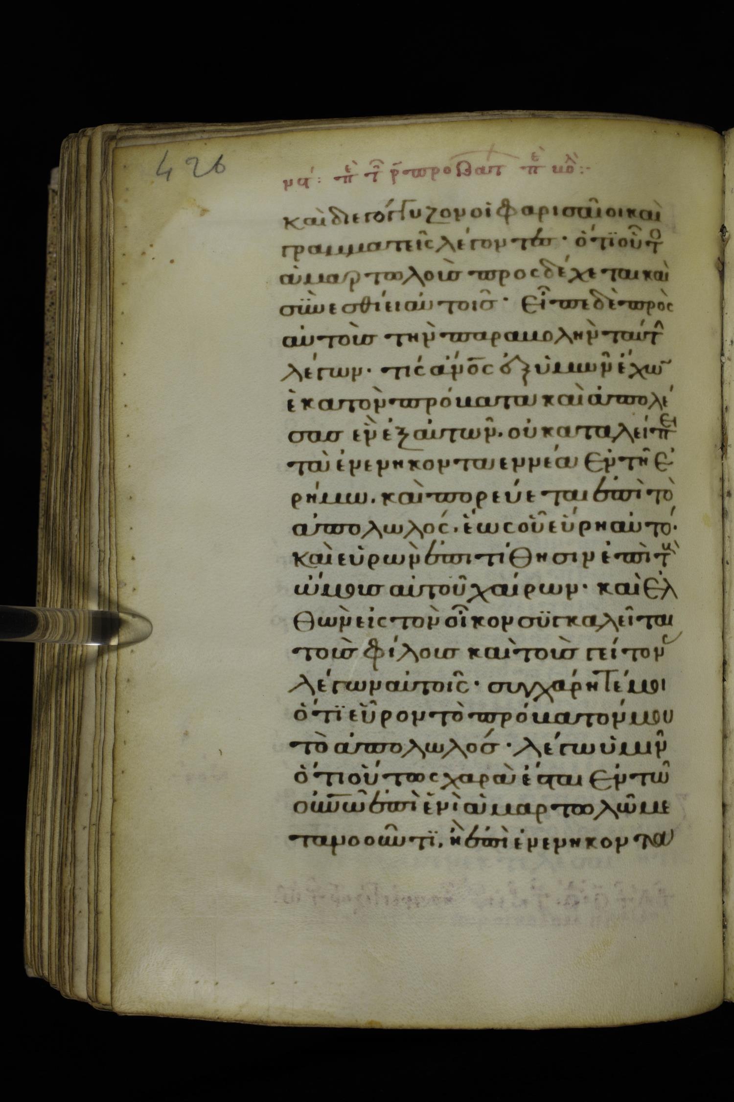 Fourteenth century minuscule of the Gospels on parchment; 332 leaves, 1 column, 21 lines per column. Images were taken at the National Library of Greece in Athens.