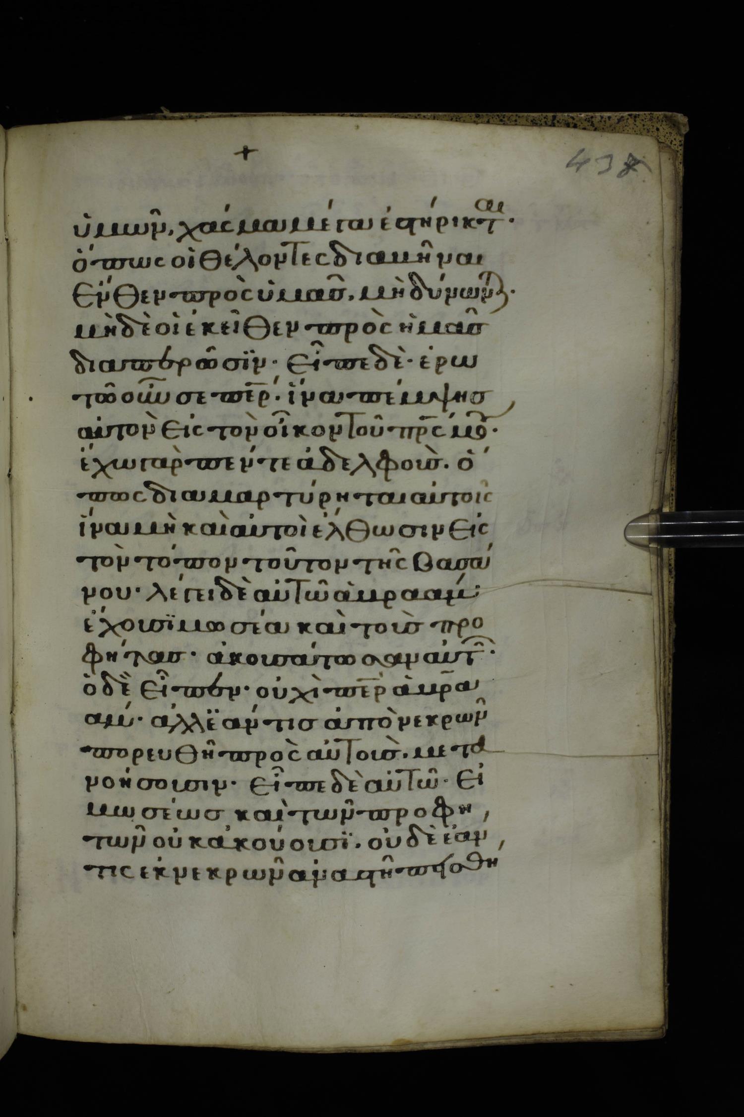 Fourteenth century minuscule of the Gospels on parchment; 332 leaves, 1 column, 21 lines per column. Images were taken at the National Library of Greece in Athens.