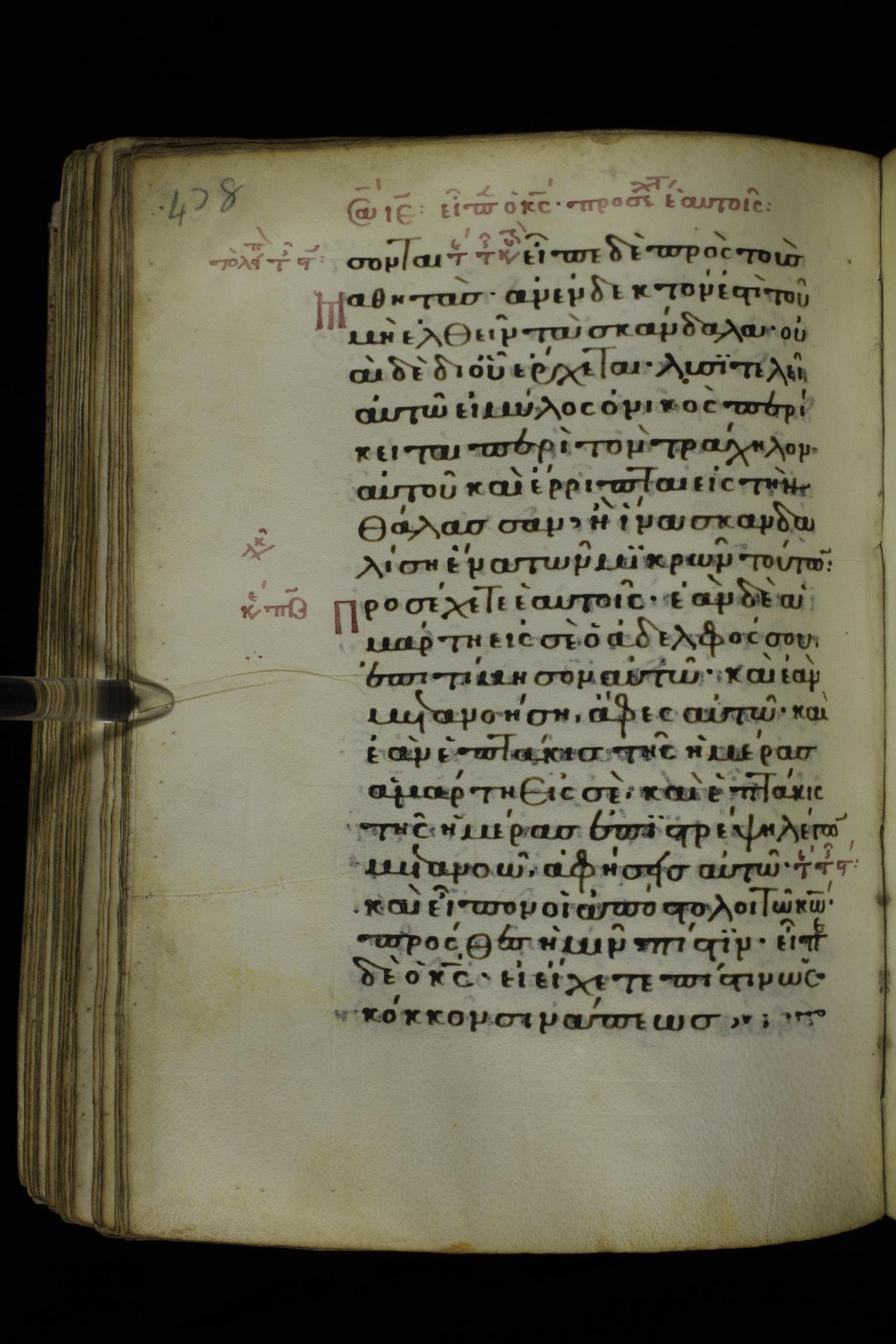 Fourteenth century minuscule of the Gospels on parchment; 332 leaves, 1 column, 21 lines per column. Images were taken at the National Library of Greece in Athens.