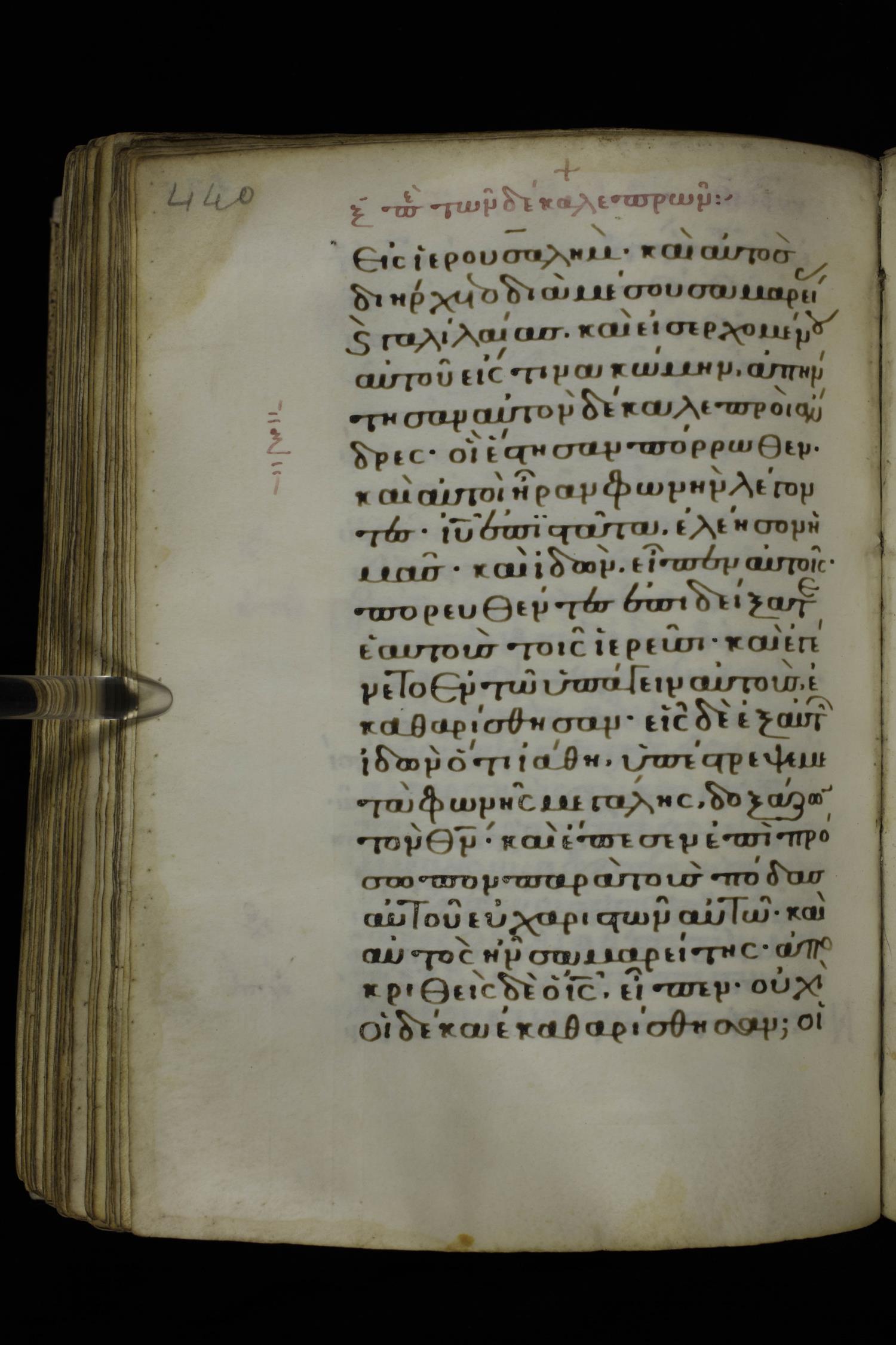 Fourteenth century minuscule of the Gospels on parchment; 332 leaves, 1 column, 21 lines per column. Images were taken at the National Library of Greece in Athens.