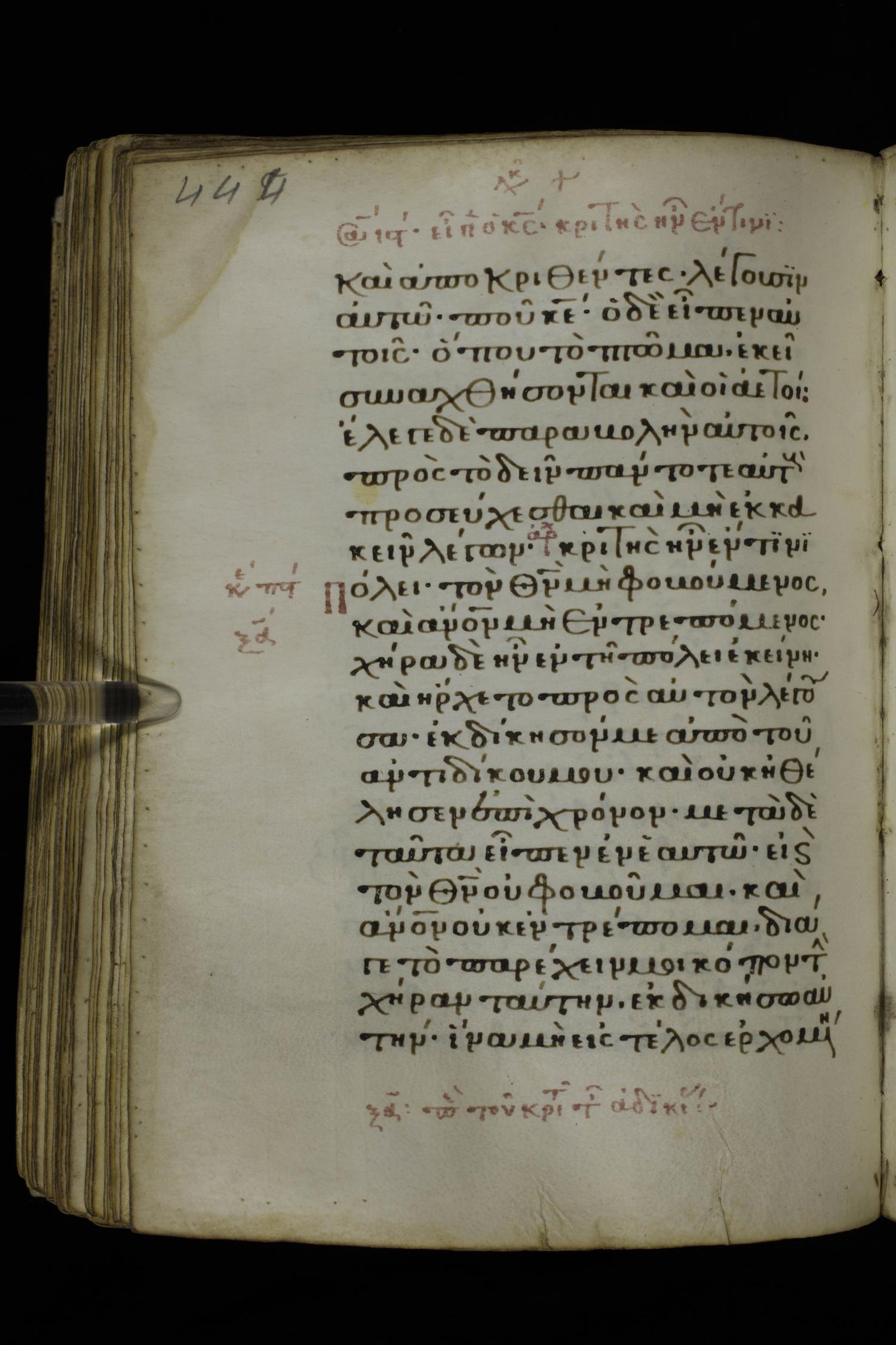 Fourteenth century minuscule of the Gospels on parchment; 332 leaves, 1 column, 21 lines per column. Images were taken at the National Library of Greece in Athens.