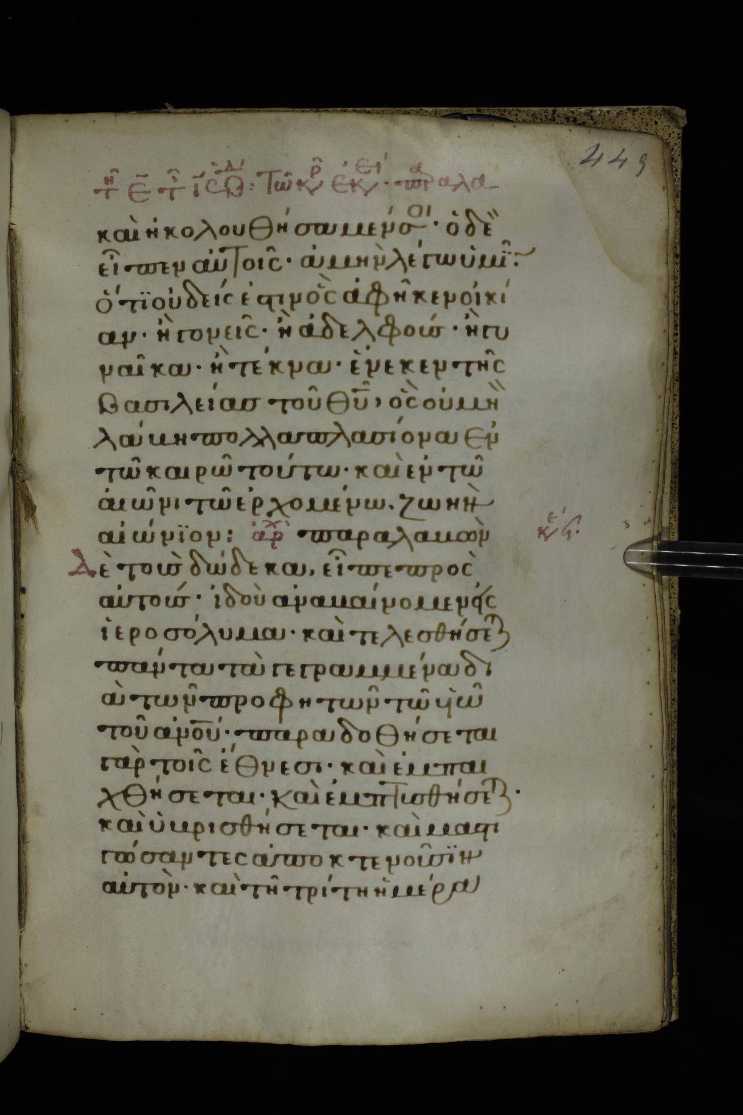 Fourteenth century minuscule of the Gospels on parchment; 332 leaves, 1 column, 21 lines per column. Images were taken at the National Library of Greece in Athens.