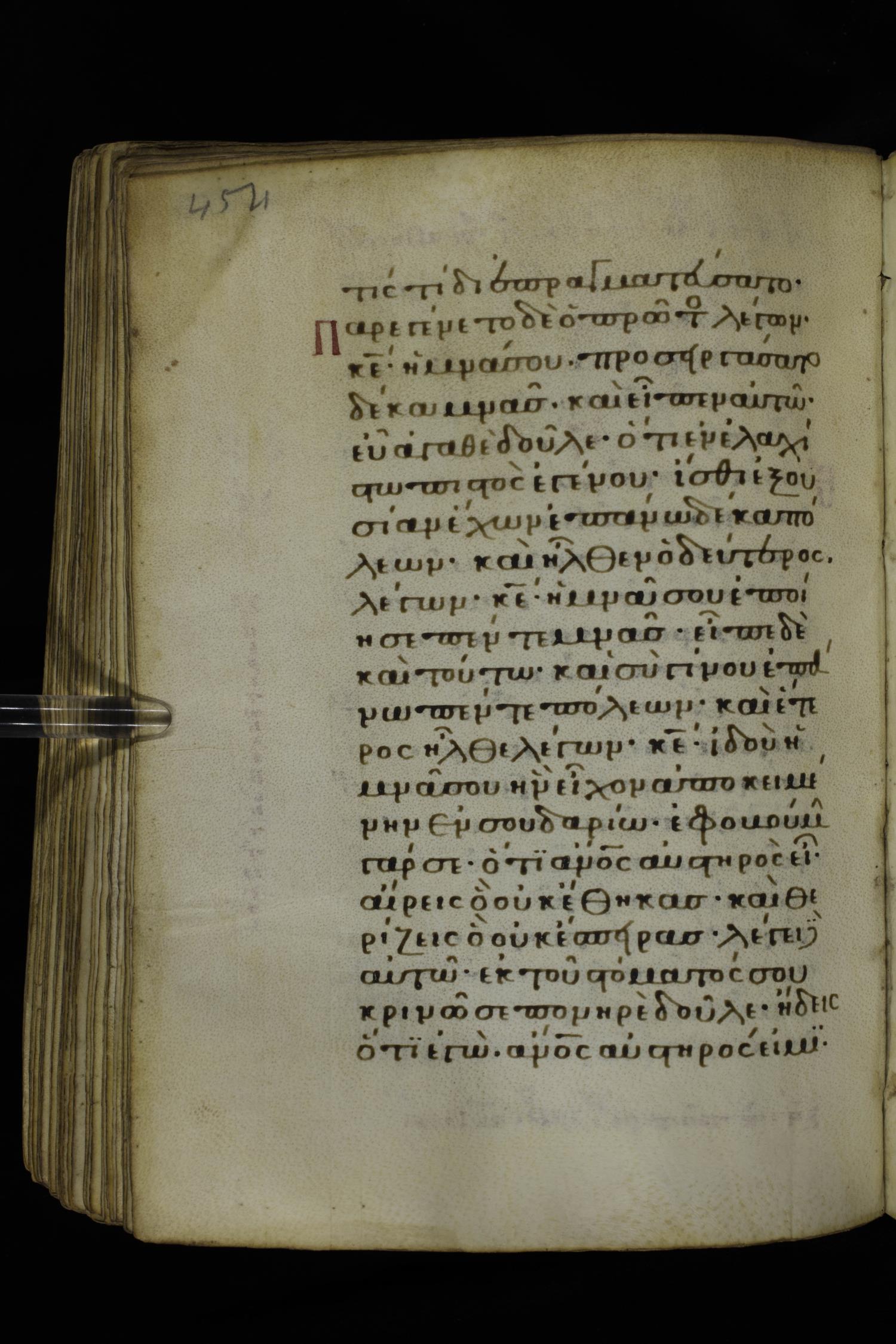 Fourteenth century minuscule of the Gospels on parchment; 332 leaves, 1 column, 21 lines per column. Images were taken at the National Library of Greece in Athens.