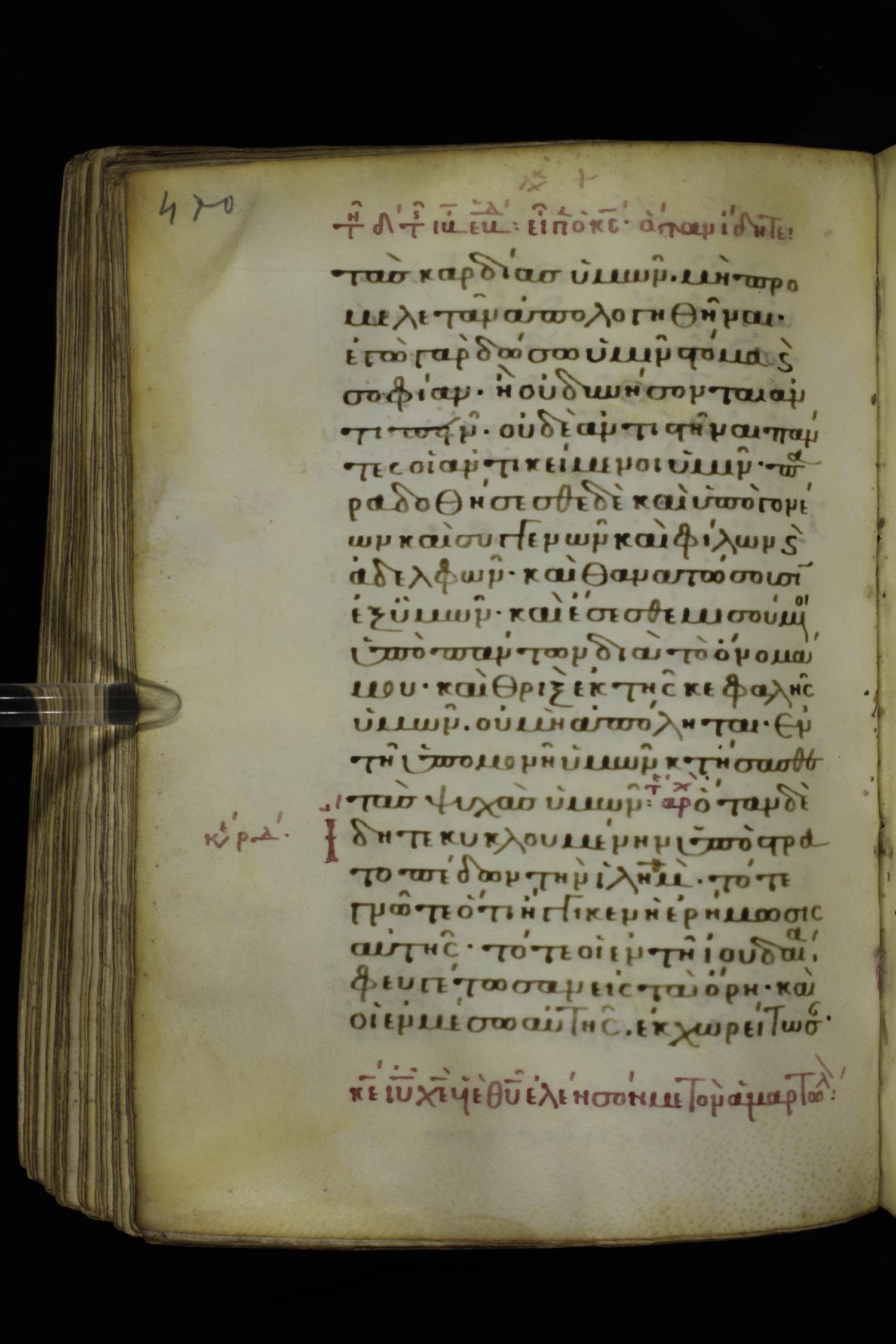 Fourteenth century minuscule of the Gospels on parchment; 332 leaves, 1 column, 21 lines per column. Images were taken at the National Library of Greece in Athens.