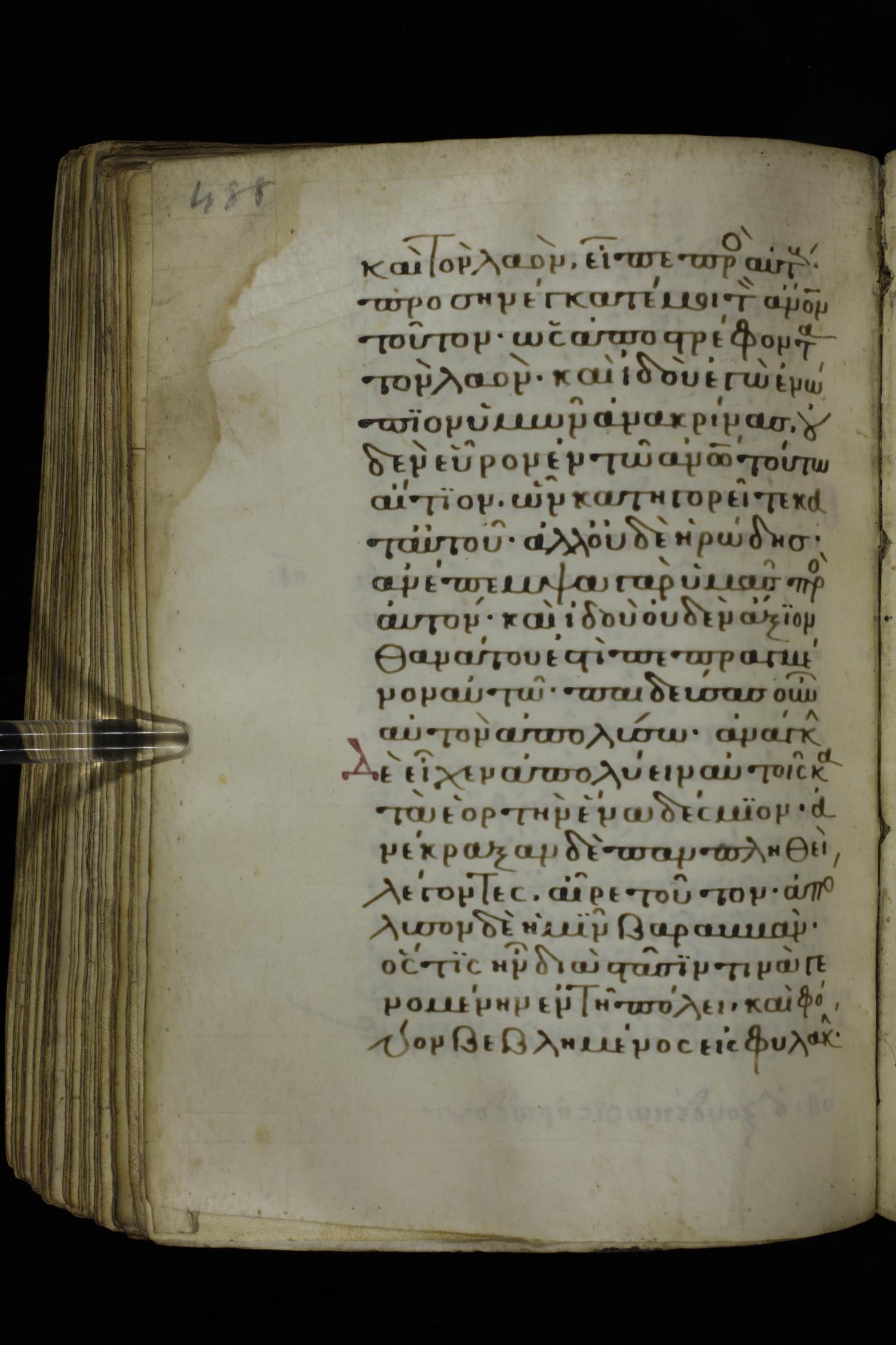 Fourteenth century minuscule of the Gospels on parchment; 332 leaves, 1 column, 21 lines per column. Images were taken at the National Library of Greece in Athens.