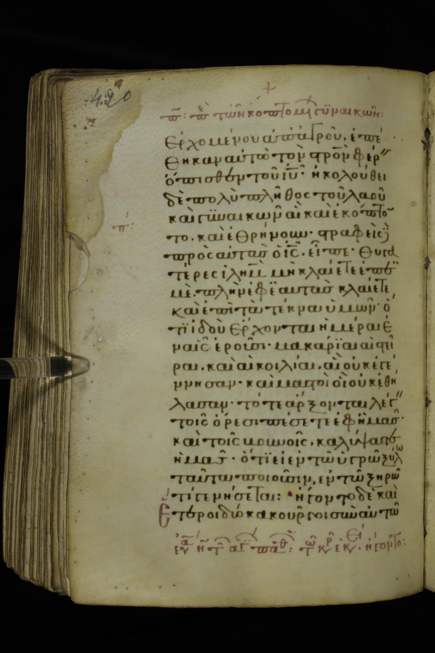 Fourteenth century minuscule of the Gospels on parchment; 332 leaves, 1 column, 21 lines per column. Images were taken at the National Library of Greece in Athens.