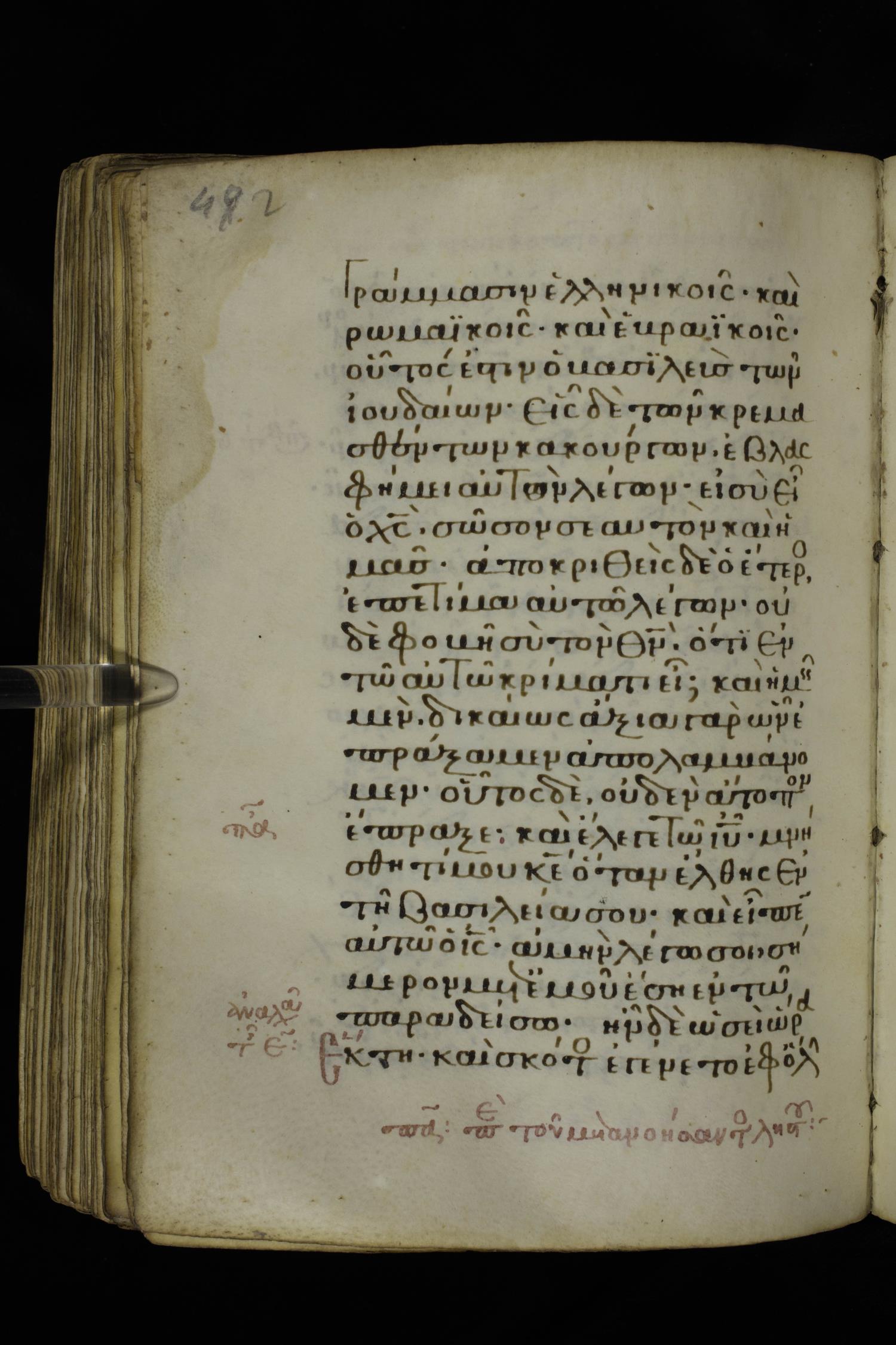 Fourteenth century minuscule of the Gospels on parchment; 332 leaves, 1 column, 21 lines per column. Images were taken at the National Library of Greece in Athens.