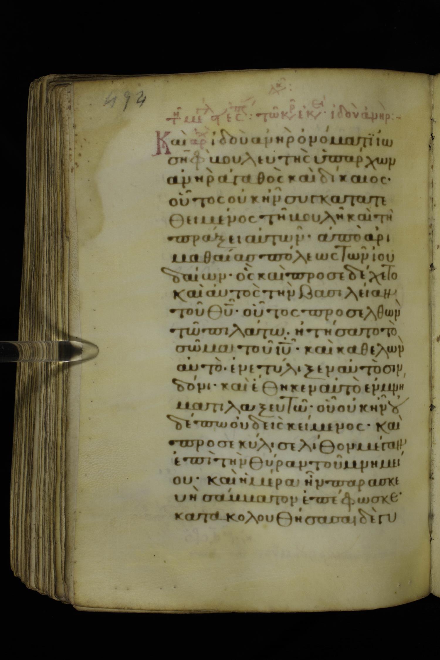Fourteenth century minuscule of the Gospels on parchment; 332 leaves, 1 column, 21 lines per column. Images were taken at the National Library of Greece in Athens.