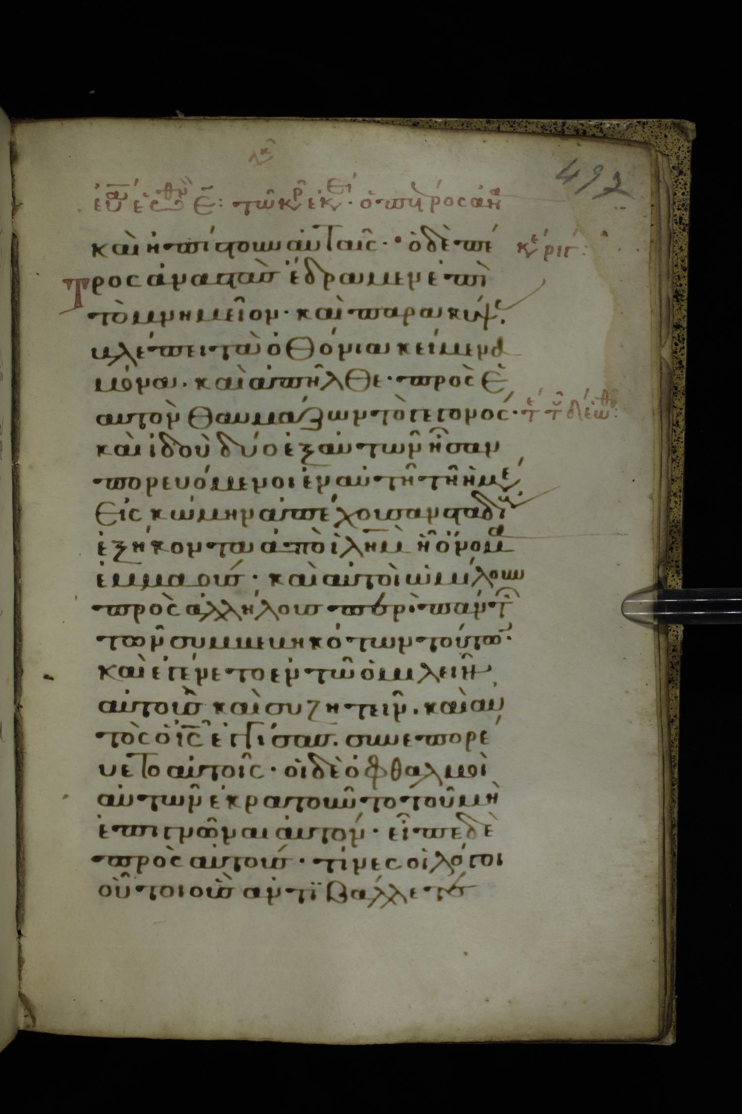 Fourteenth century minuscule of the Gospels on parchment; 332 leaves, 1 column, 21 lines per column. Images were taken at the National Library of Greece in Athens.