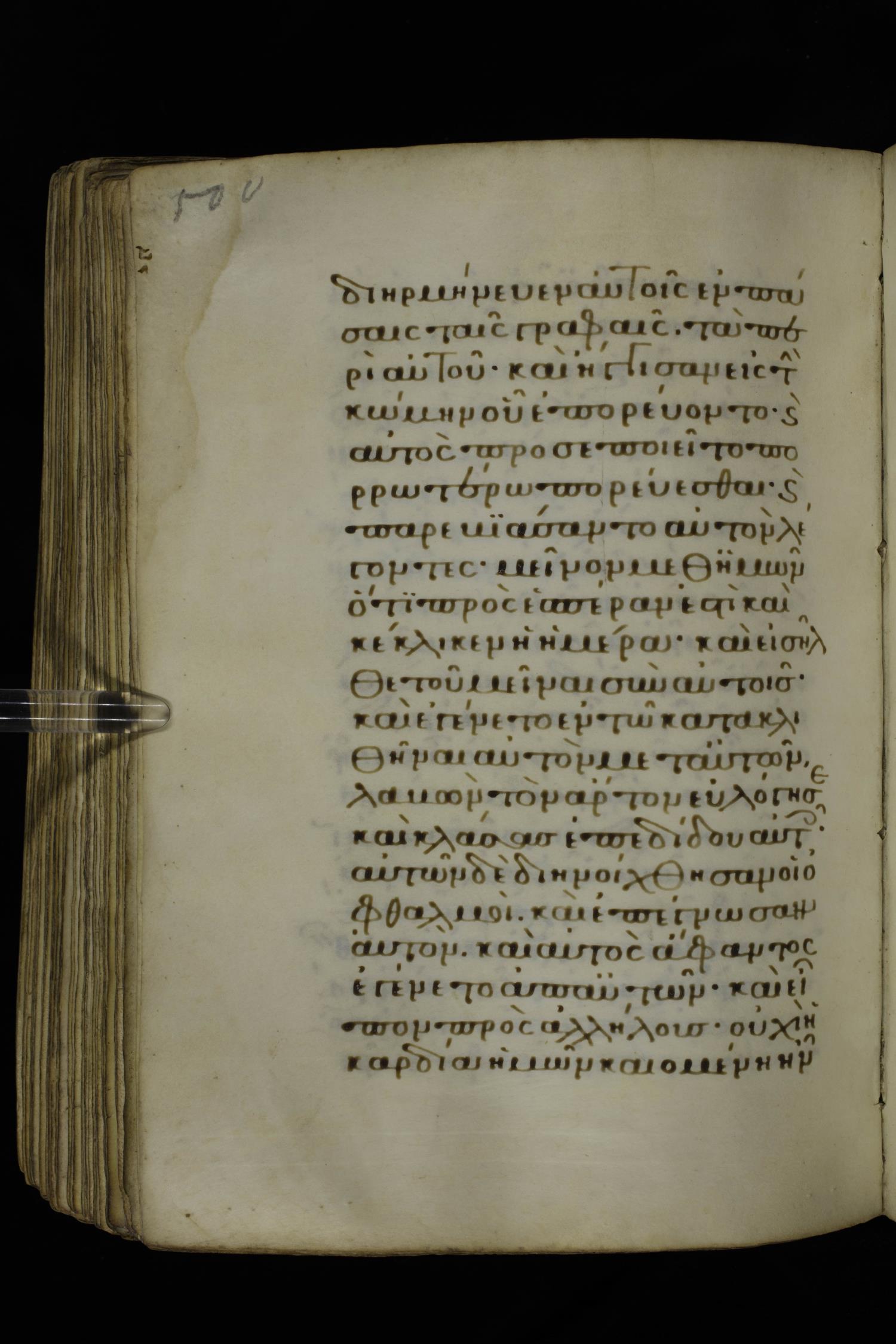 Fourteenth century minuscule of the Gospels on parchment; 332 leaves, 1 column, 21 lines per column. Images were taken at the National Library of Greece in Athens.