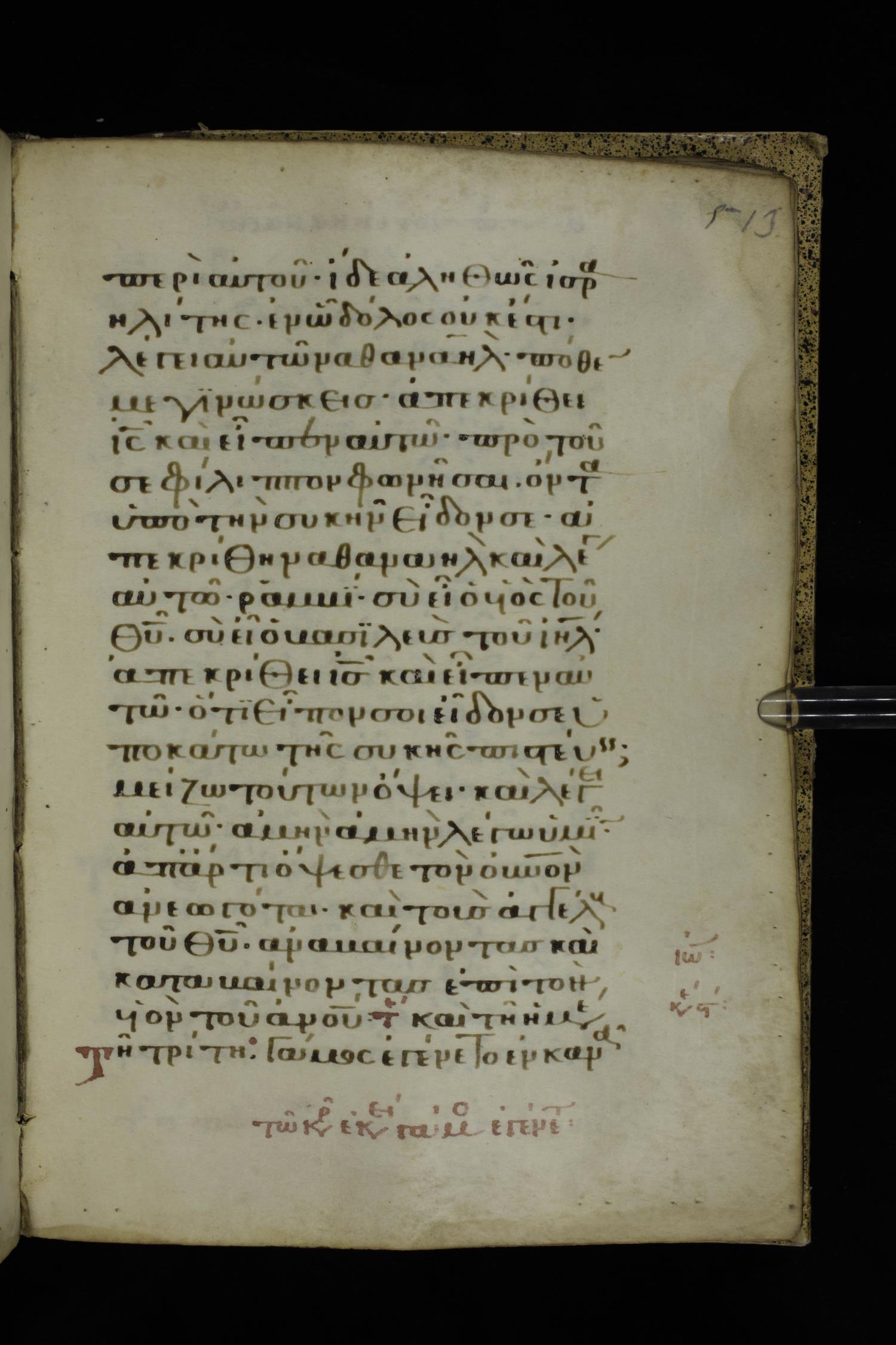 Fourteenth century minuscule of the Gospels on parchment; 332 leaves, 1 column, 21 lines per column. Images were taken at the National Library of Greece in Athens.
