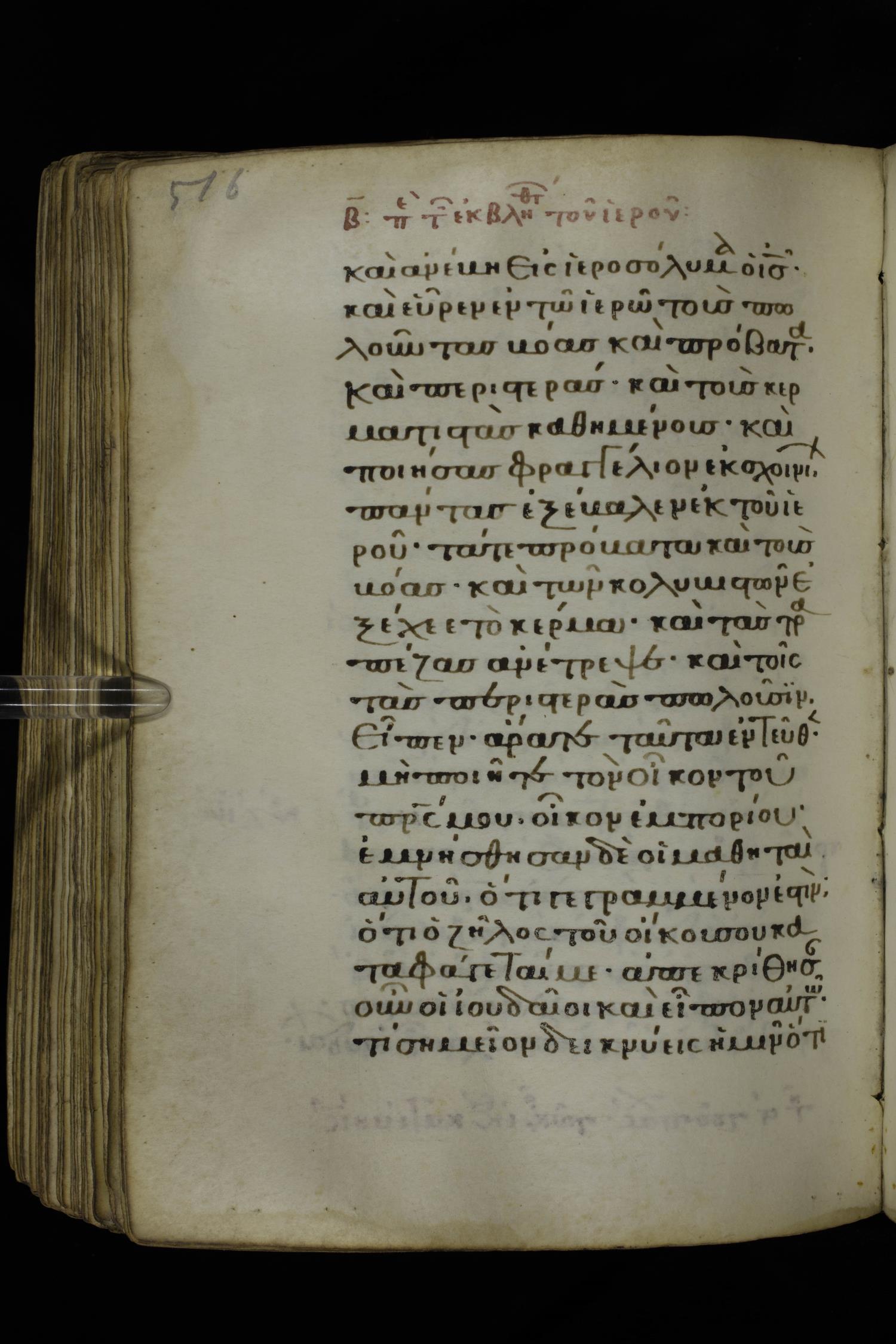 Fourteenth century minuscule of the Gospels on parchment; 332 leaves, 1 column, 21 lines per column. Images were taken at the National Library of Greece in Athens.
