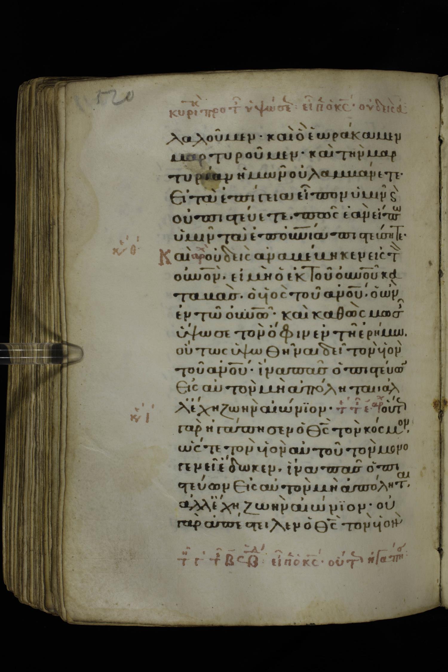 Fourteenth century minuscule of the Gospels on parchment; 332 leaves, 1 column, 21 lines per column. Images were taken at the National Library of Greece in Athens.