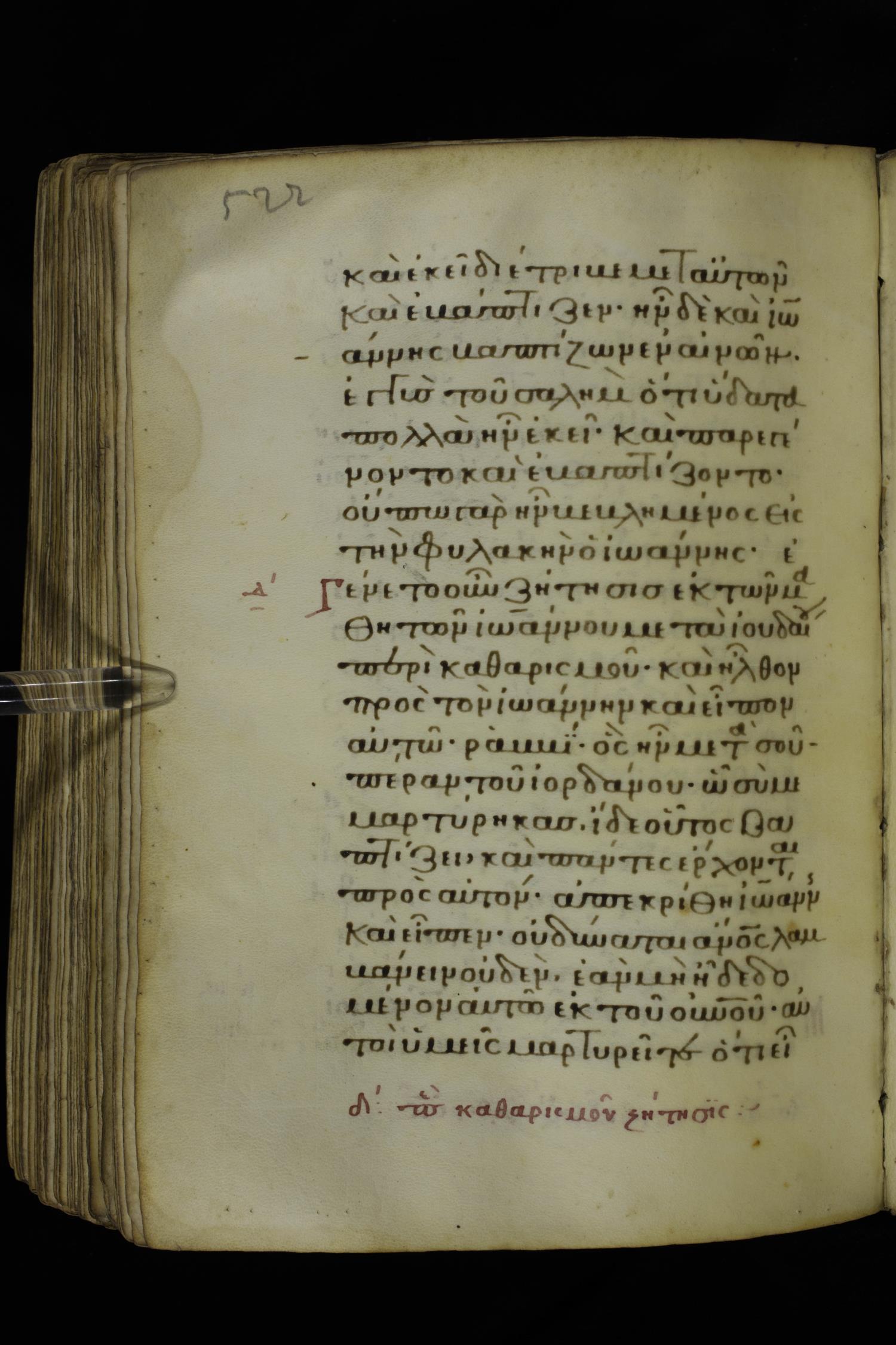 Fourteenth century minuscule of the Gospels on parchment; 332 leaves, 1 column, 21 lines per column. Images were taken at the National Library of Greece in Athens.