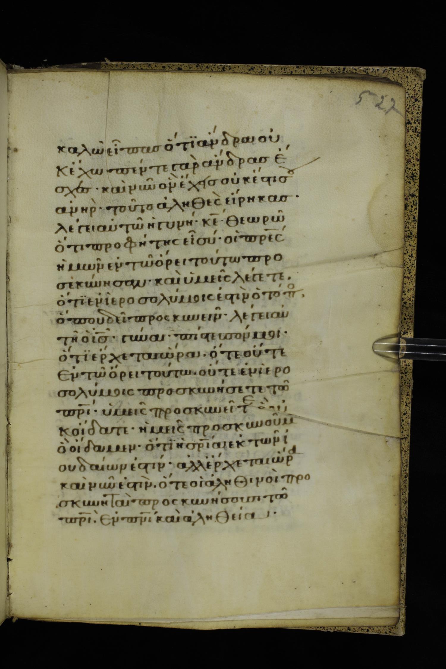 Fourteenth century minuscule of the Gospels on parchment; 332 leaves, 1 column, 21 lines per column. Images were taken at the National Library of Greece in Athens.
