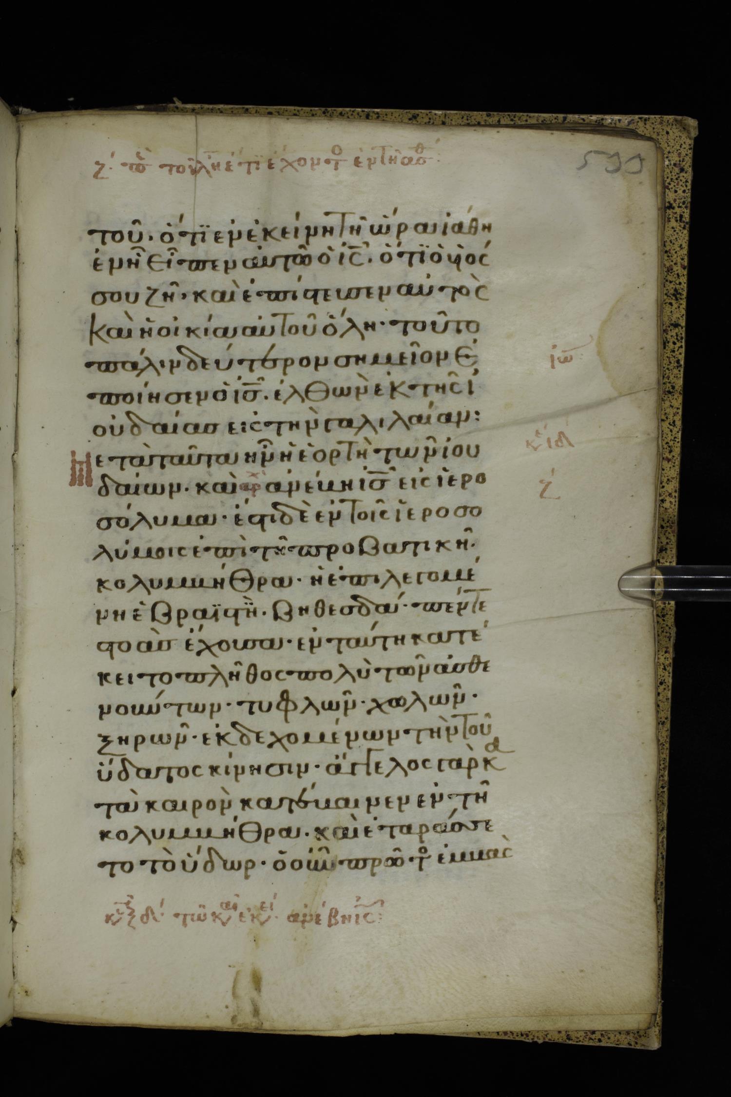 Fourteenth century minuscule of the Gospels on parchment; 332 leaves, 1 column, 21 lines per column. Images were taken at the National Library of Greece in Athens.