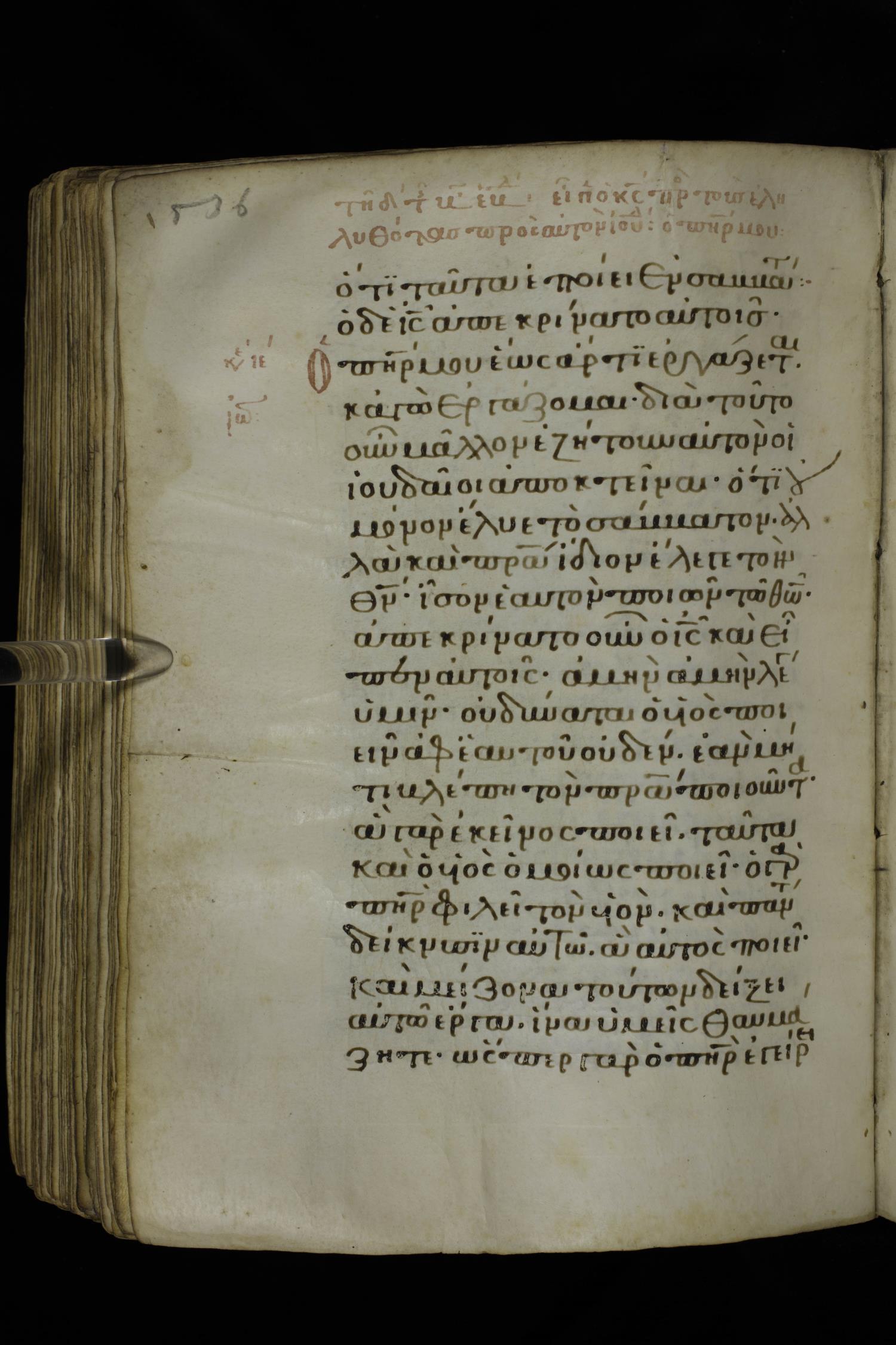 Fourteenth century minuscule of the Gospels on parchment; 332 leaves, 1 column, 21 lines per column. Images were taken at the National Library of Greece in Athens.