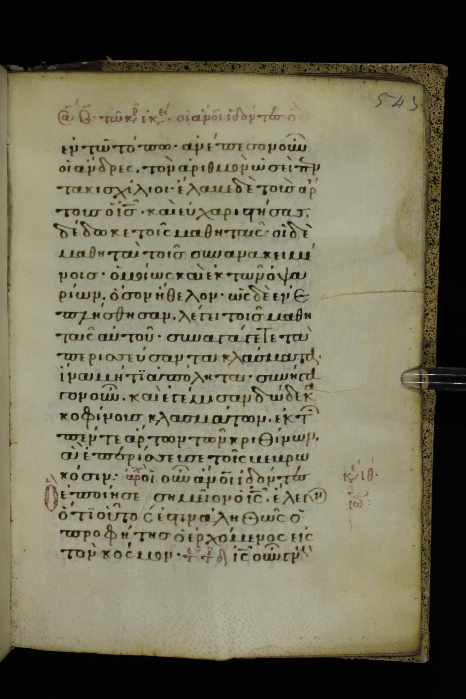 Fourteenth century minuscule of the Gospels on parchment; 332 leaves, 1 column, 21 lines per column. Images were taken at the National Library of Greece in Athens.