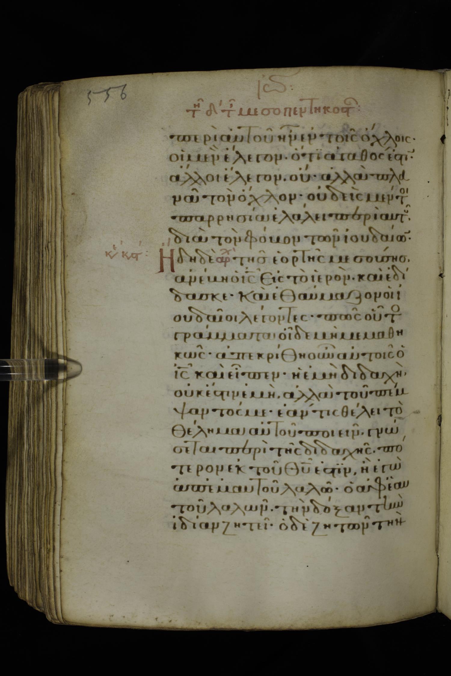 Fourteenth century minuscule of the Gospels on parchment; 332 leaves, 1 column, 21 lines per column. Images were taken at the National Library of Greece in Athens.