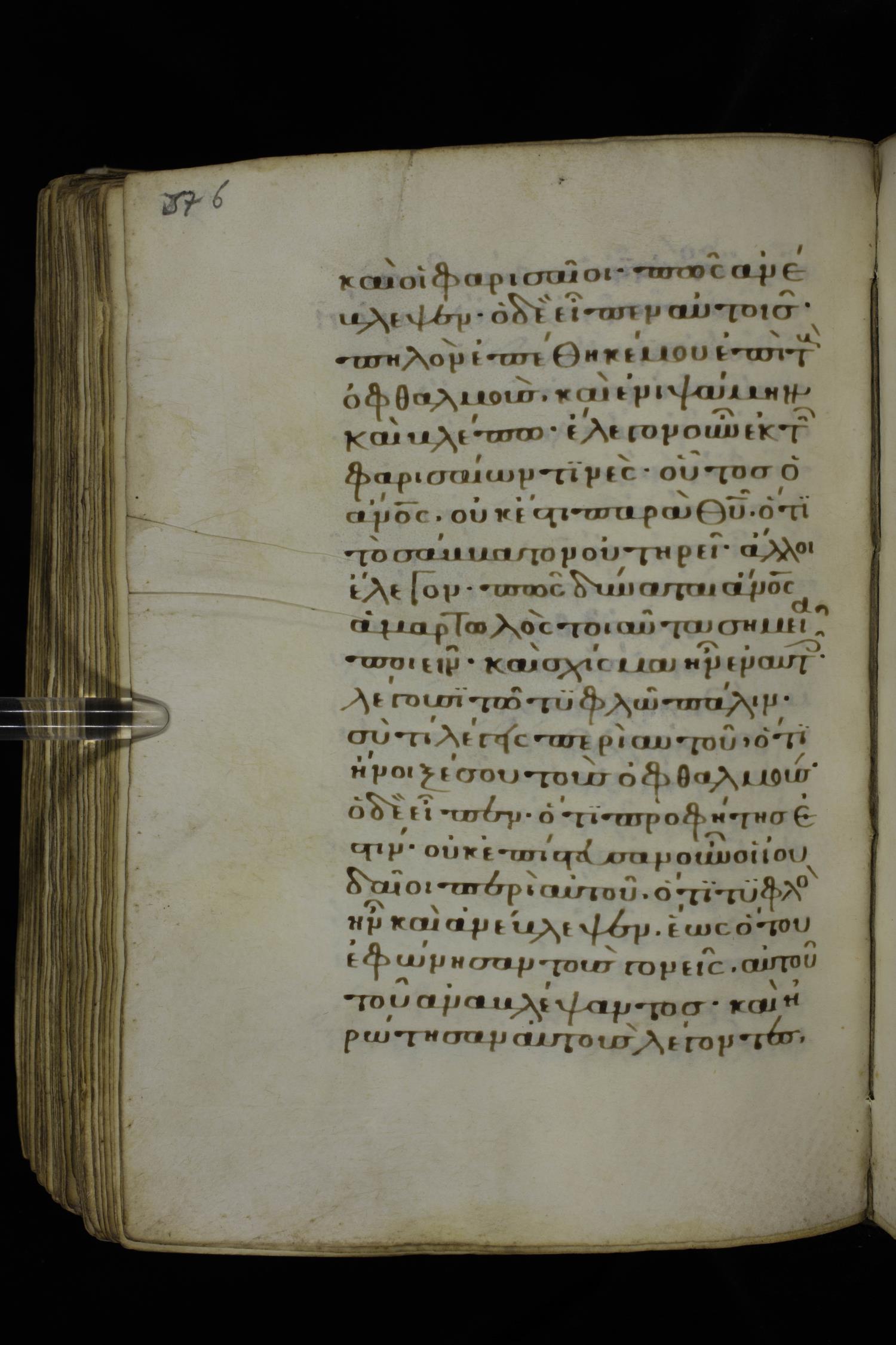Fourteenth century minuscule of the Gospels on parchment; 332 leaves, 1 column, 21 lines per column. Images were taken at the National Library of Greece in Athens.