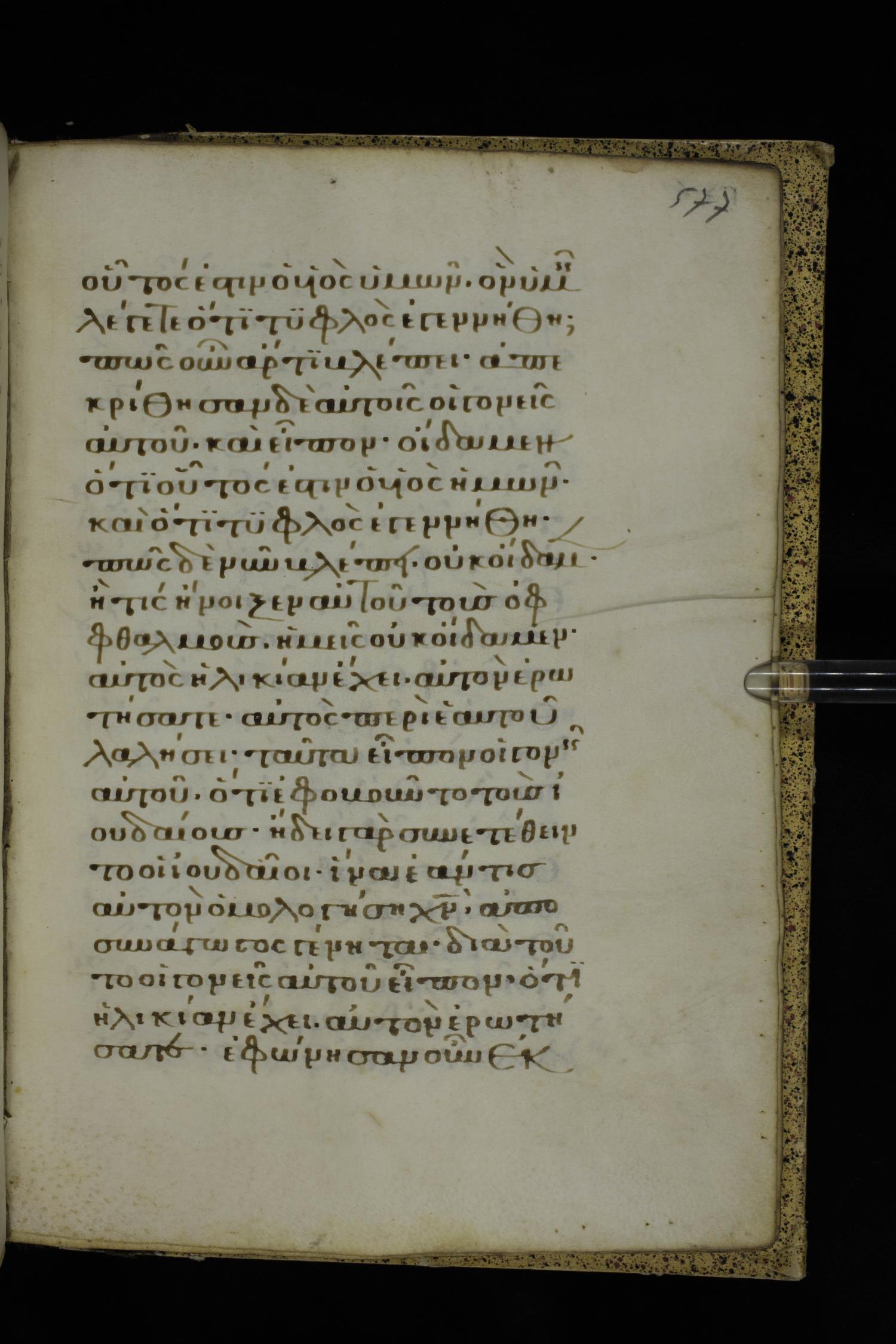 Fourteenth century minuscule of the Gospels on parchment; 332 leaves, 1 column, 21 lines per column. Images were taken at the National Library of Greece in Athens.
