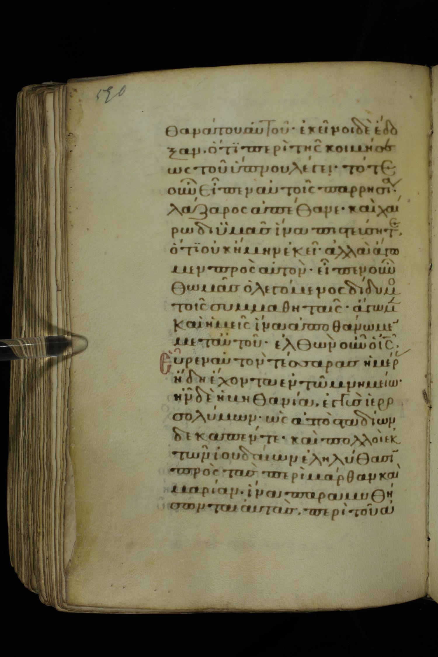 Fourteenth century minuscule of the Gospels on parchment; 332 leaves, 1 column, 21 lines per column. Images were taken at the National Library of Greece in Athens.