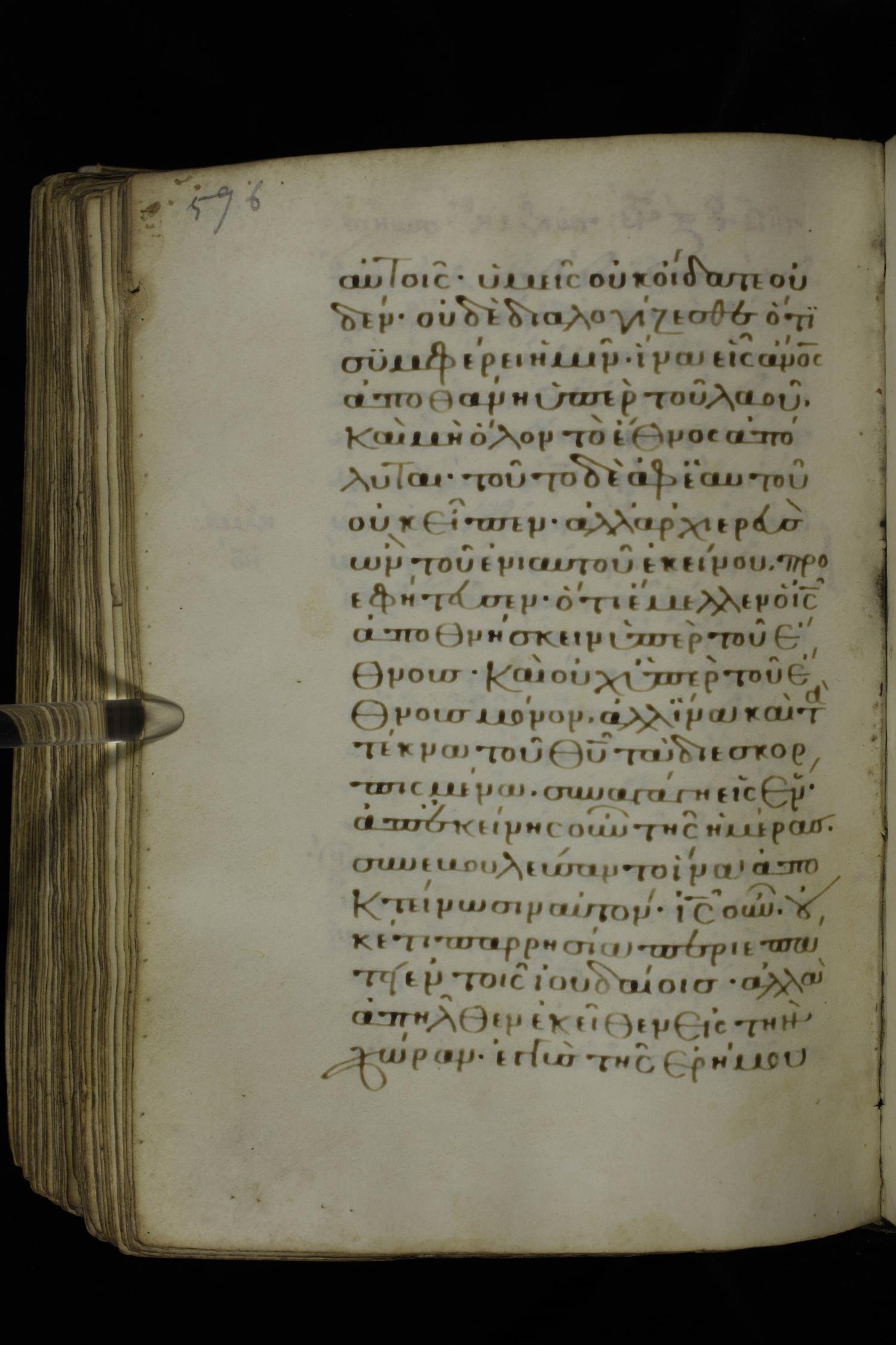 Fourteenth century minuscule of the Gospels on parchment; 332 leaves, 1 column, 21 lines per column. Images were taken at the National Library of Greece in Athens.