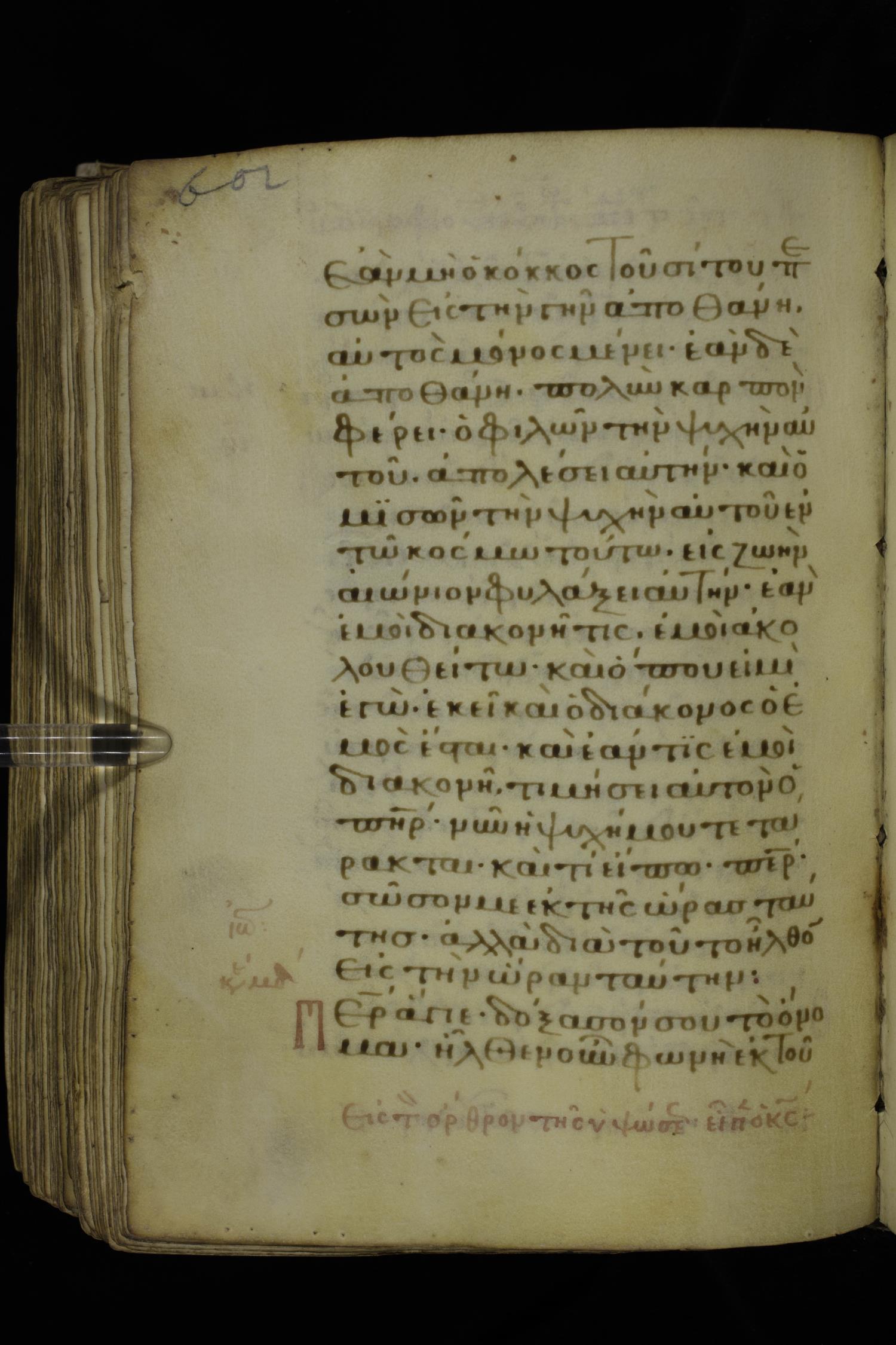 Fourteenth century minuscule of the Gospels on parchment; 332 leaves, 1 column, 21 lines per column. Images were taken at the National Library of Greece in Athens.