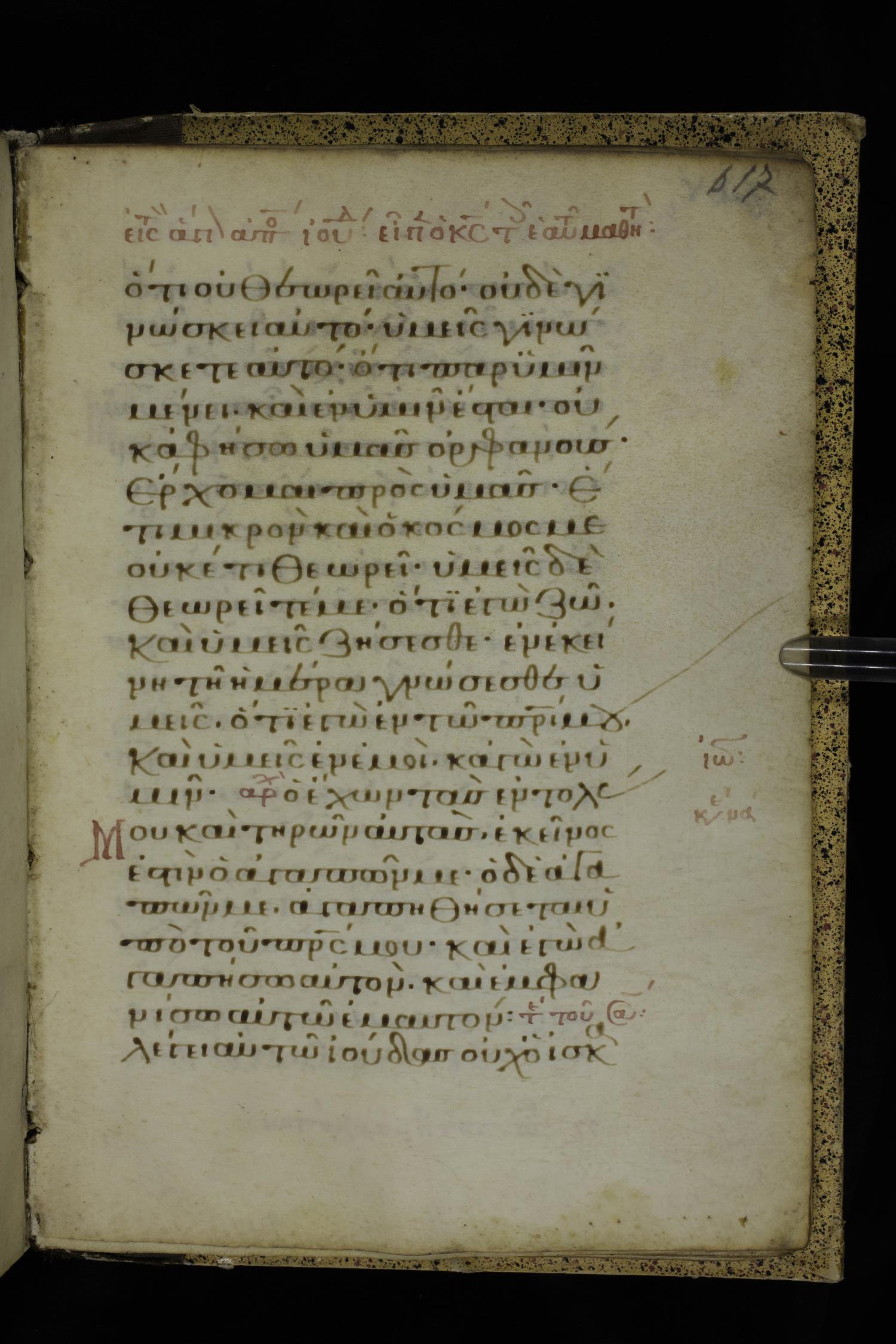 Fourteenth century minuscule of the Gospels on parchment; 332 leaves, 1 column, 21 lines per column. Images were taken at the National Library of Greece in Athens.