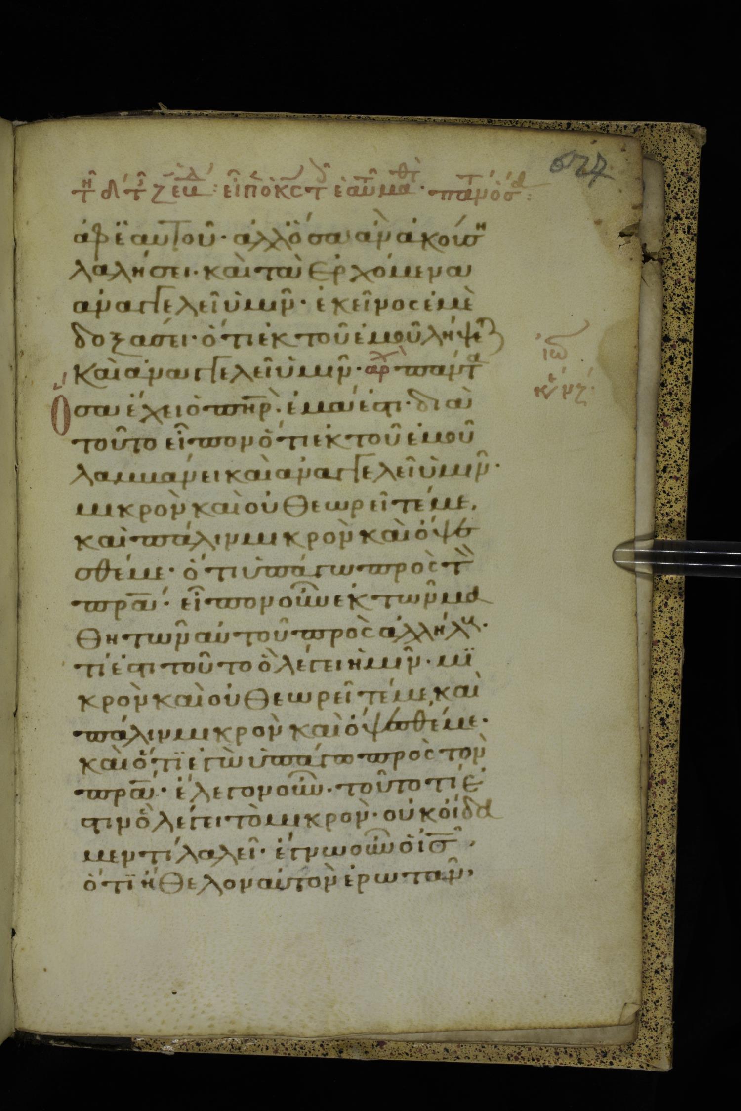 Fourteenth century minuscule of the Gospels on parchment; 332 leaves, 1 column, 21 lines per column. Images were taken at the National Library of Greece in Athens.